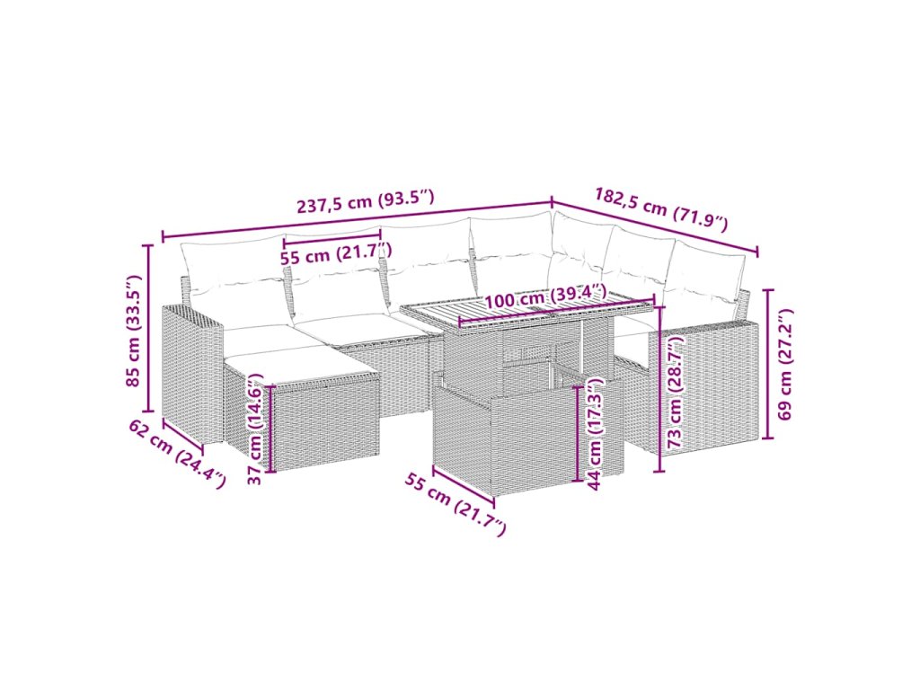Tato zahradní sedací souprava je dokonalým doplňkem vaší zahrady, terasy nebo dvorku a poskytne vám pohodlné a příjemné místo, kde si můžete povídat s rodinou a přáteli nebo jen tak odpočívat a užívat si pobyt venku.
