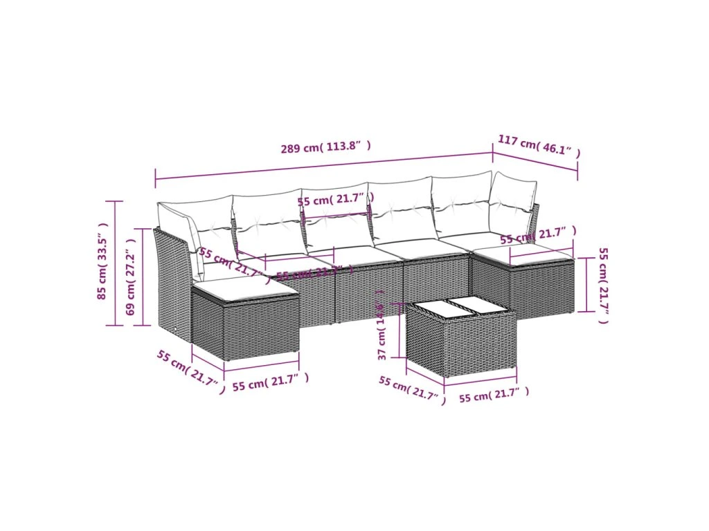 - Celkové rozměry pohovky: 289 x 117 x 69 cm (Š x H x V)