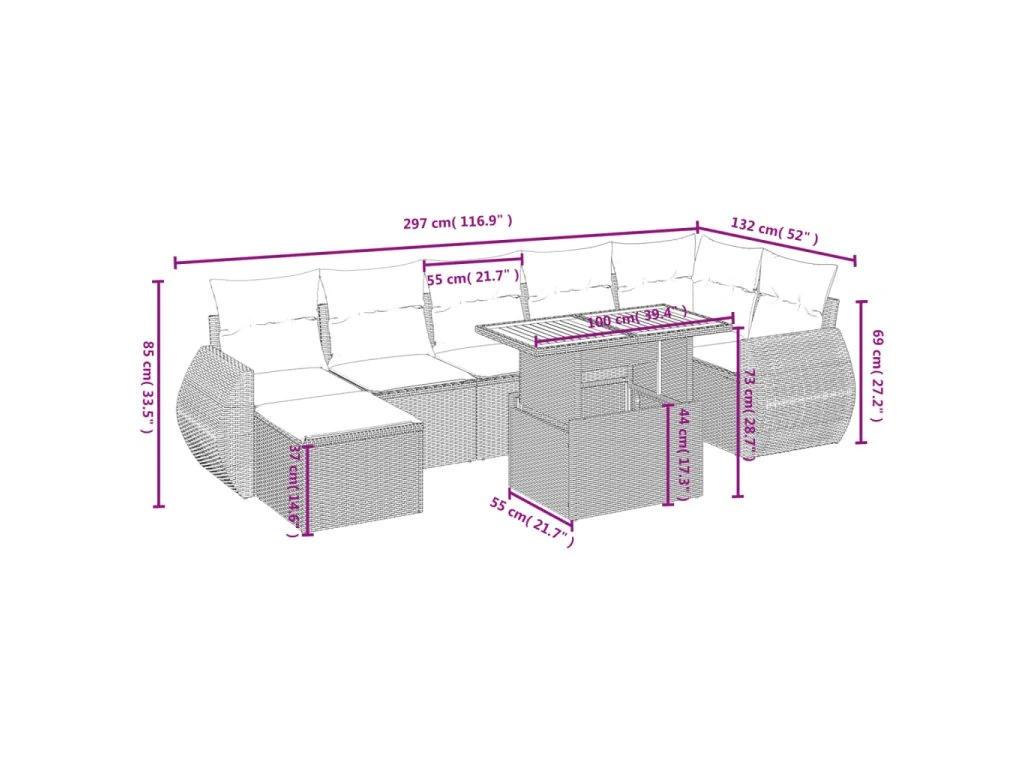 Tato zahradní sedací souprava je dokonalým doplňkem vaší zahrady, terasy nebo dvorku a poskytne vám pohodlné a příjemné místo, kde si můžete povídat s rodinou a přáteli nebo jen tak odpočívat a užívat si pobyt venku.