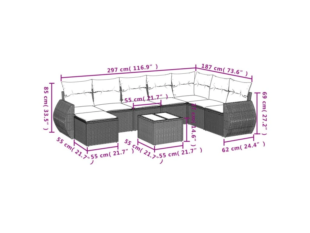 Tato zahradní sedací souprava je dokonalým doplňkem vaší zahrady, terasy nebo dvorku a poskytne vám pohodlné a příjemné místo, kde si můžete povídat s rodinou a přáteli nebo jen tak odpočívat a užívat si pobyt venku.