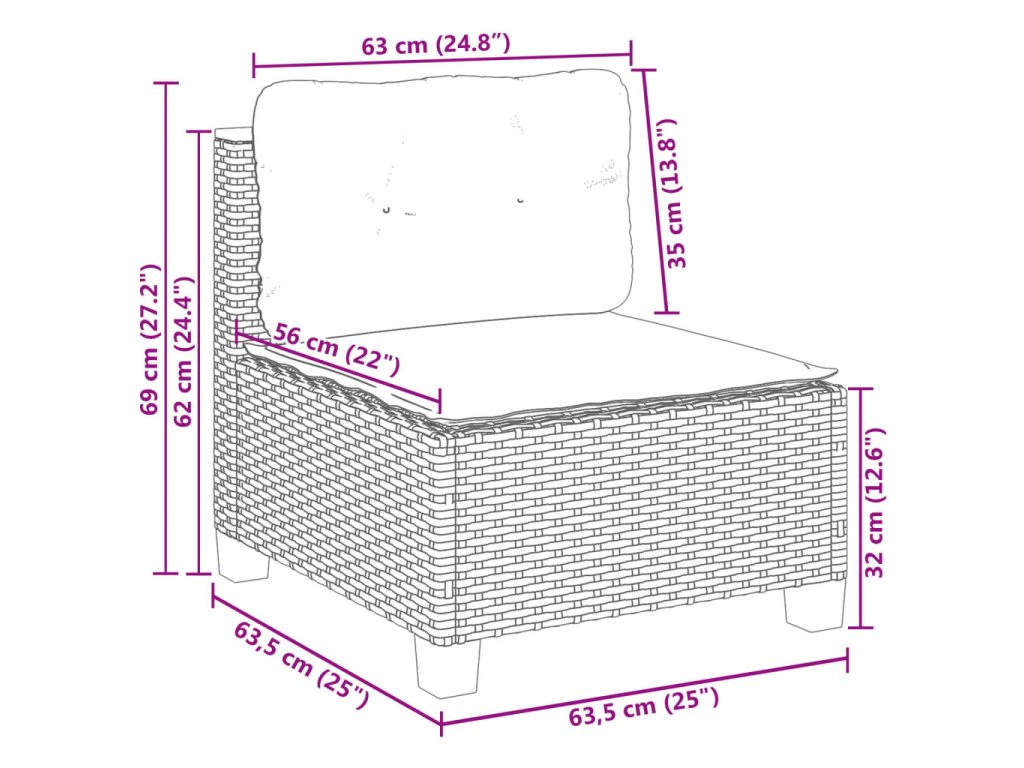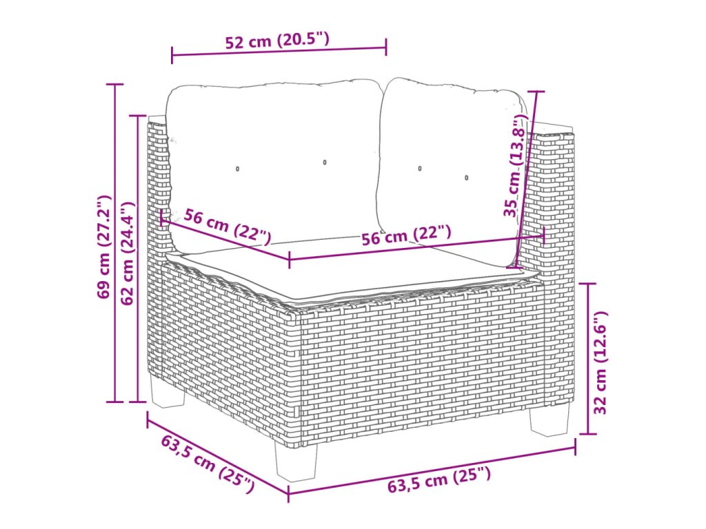 - Rozměry podušky na sedák (středový díl): 63,5 x 56,5 x 3 cm (Š x H x T)