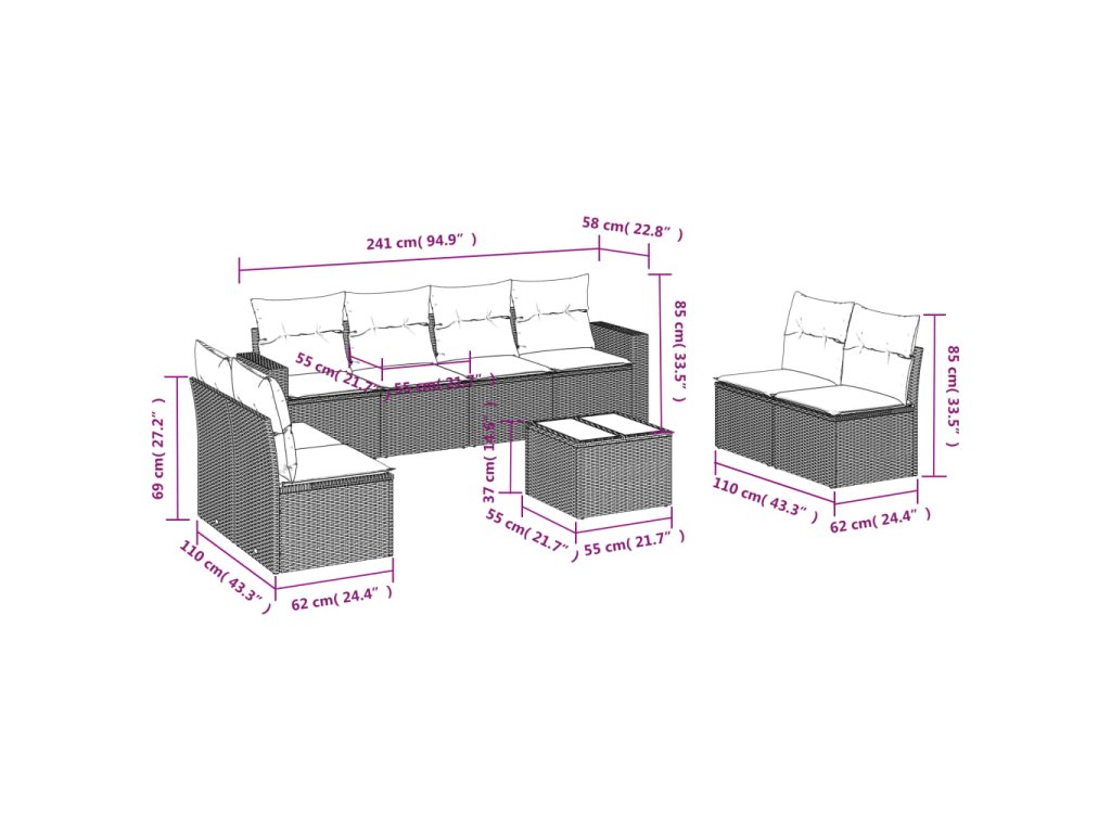 9dílná zahradní sedací souprava a podušky světle šedá polyratan 3218852