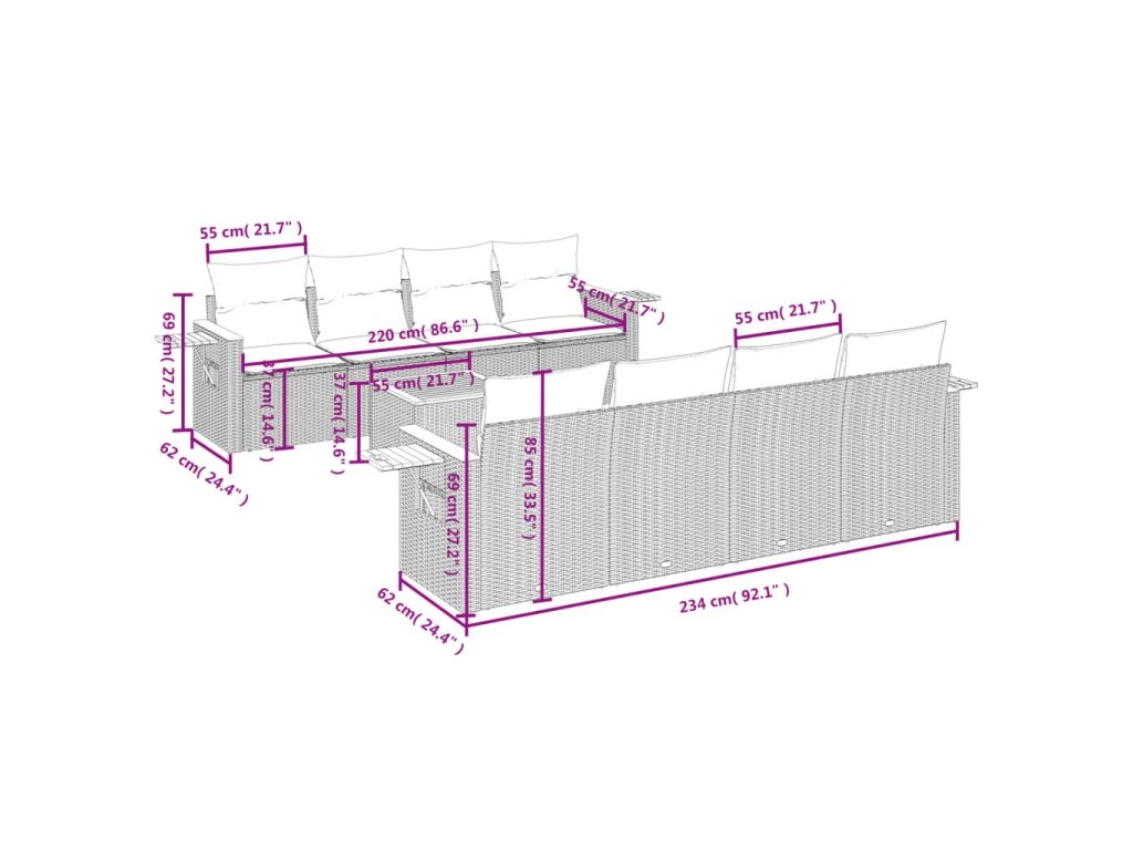 Tato zahradní sedací souprava je dokonalým doplňkem vaší zahrady, terasy nebo dvorku a poskytne vám pohodlné a příjemné místo, kde si můžete povídat s rodinou a přáteli nebo jen tak odpočívat a užívat si pobyt venku.