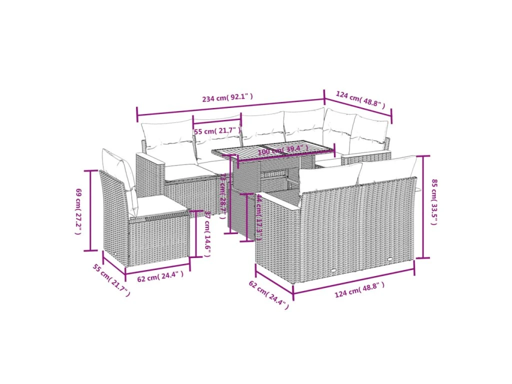 Tato zahradní sedací souprava je dokonalým doplňkem vaší zahrady, terasy nebo dvorku a poskytne vám pohodlné a příjemné místo, kde si můžete povídat s rodinou a přáteli nebo jen tak odpočívat a užívat si pobyt venku.