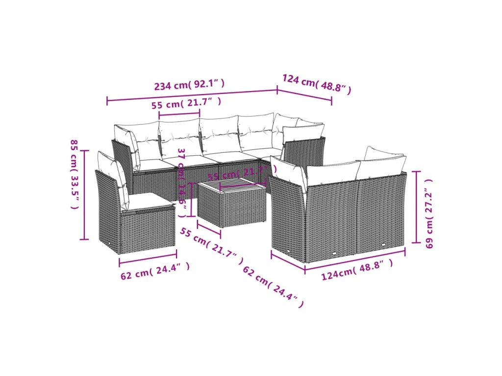 Tato zahradní sedací souprava je dokonalým doplňkem vaší zahrady, terasy nebo dvorku a poskytne vám pohodlné a příjemné místo, kde si můžete povídat s rodinou a přáteli nebo jen tak odpočívat a užívat si pobyt venku.