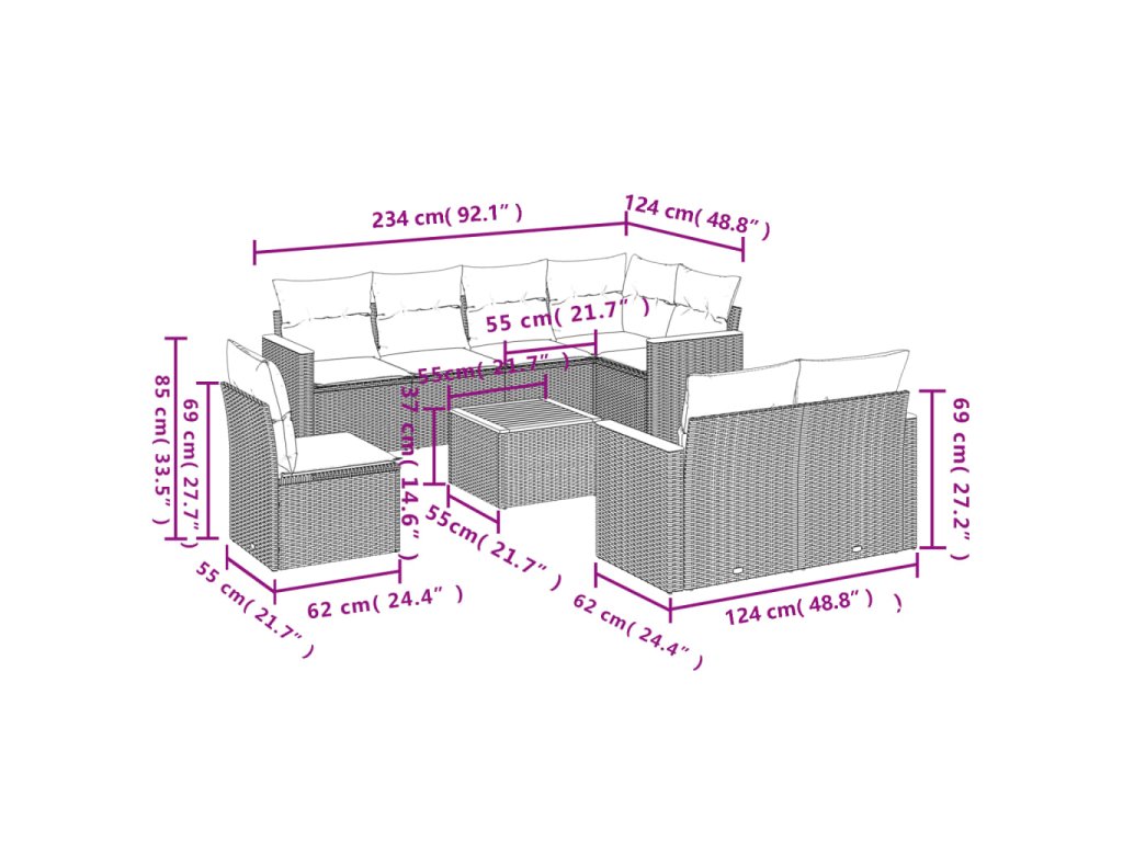 Tato zahradní sedací souprava je dokonalým doplňkem vaší zahrady, terasy nebo dvorku a poskytne vám pohodlné a příjemné místo, kde si můžete povídat s rodinou a přáteli nebo jen tak odpočívat a užívat si pobyt venku.
