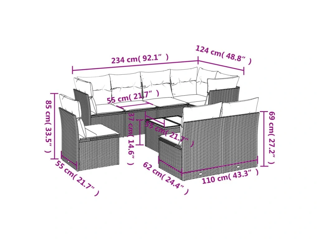Tato zahradní sedací souprava je dokonalým doplňkem vaší zahrady, terasy nebo dvorku a poskytne vám pohodlné a příjemné místo, kde si můžete povídat s rodinou a přáteli nebo jen tak odpočívat a užívat si pobyt venku.