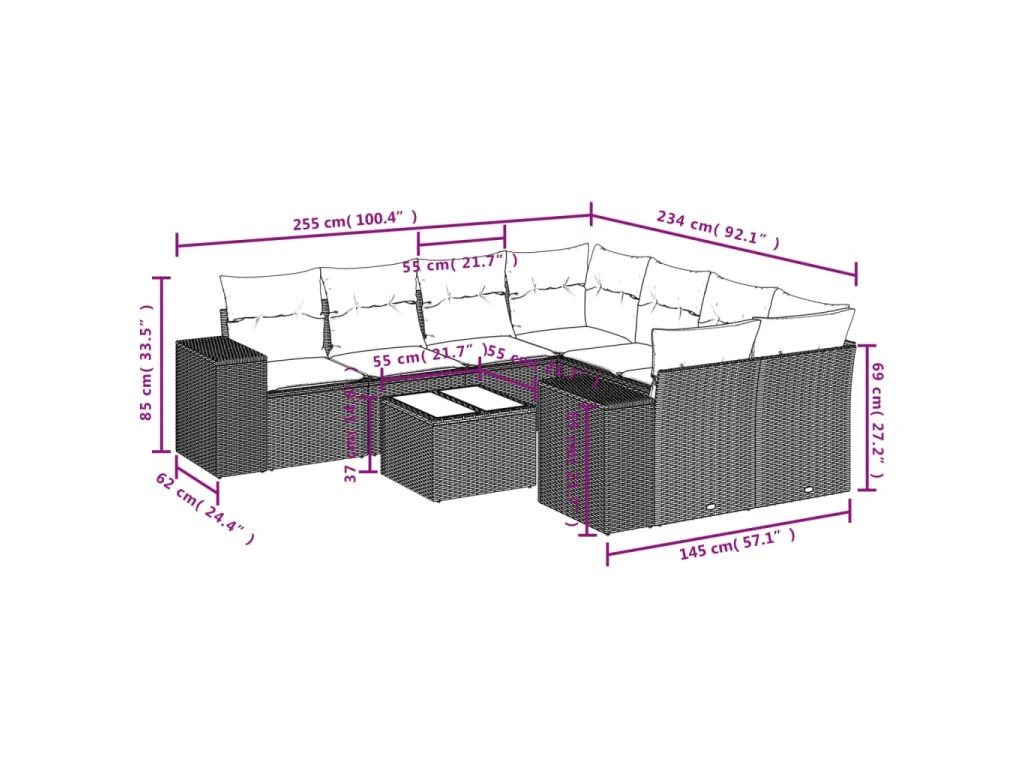 Tato zahradní sedací souprava je dokonalým doplňkem vaší zahrady, terasy nebo dvorku a poskytne vám pohodlné a příjemné místo, kde si můžete povídat s rodinou a přáteli nebo jen tak odpočívat a užívat si pobyt venku.