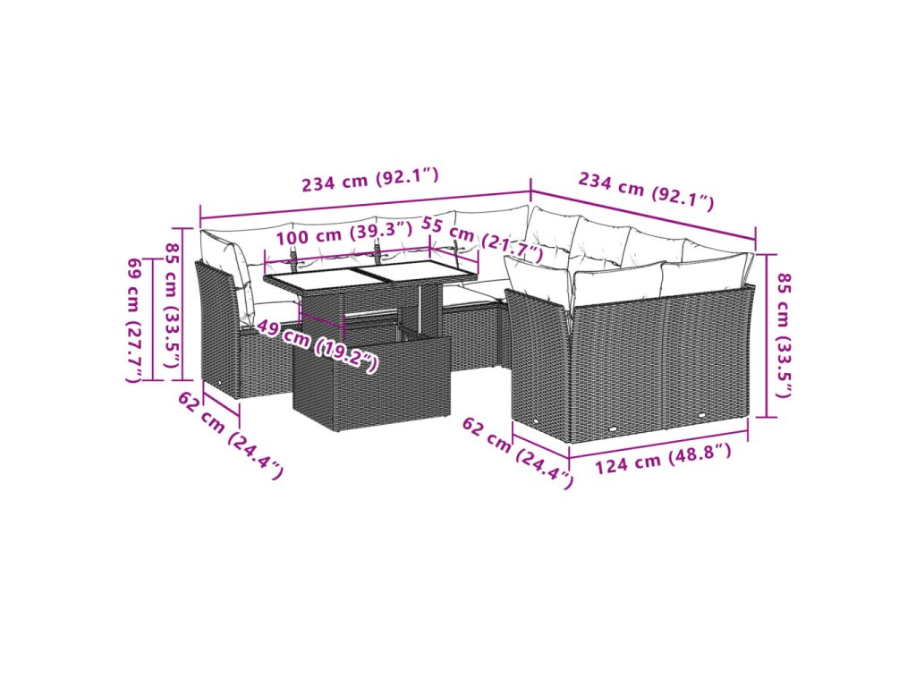 Tato zahradní sedací souprava je dokonalým doplňkem vaší zahrady, terasy nebo dvorku a poskytne vám pohodlné a příjemné místo, kde si můžete povídat s rodinou a přáteli nebo jen tak odpočívat a užívat si pobyt venku.