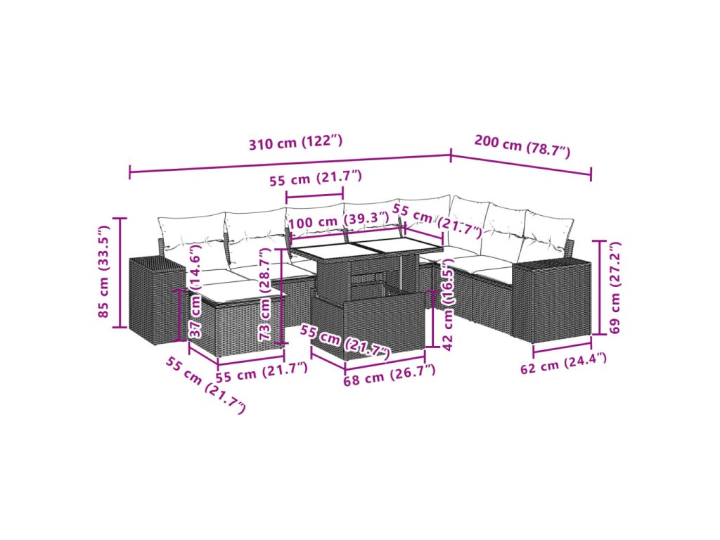 Tato zahradní sedací souprava je dokonalým doplňkem vaší zahrady, terasy nebo dvorku a poskytne vám pohodlné a příjemné místo, kde si můžete povídat s rodinou a přáteli nebo jen tak odpočívat a užívat si pobyt venku.