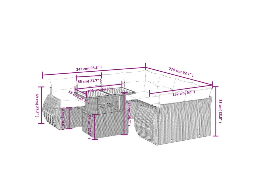 Tato zahradní sedací souprava je dokonalým doplňkem vaší zahrady, terasy nebo dvorku a poskytne vám pohodlné a příjemné místo, kde si můžete povídat s rodinou a přáteli nebo jen tak odpočívat a užívat si pobyt venku.
