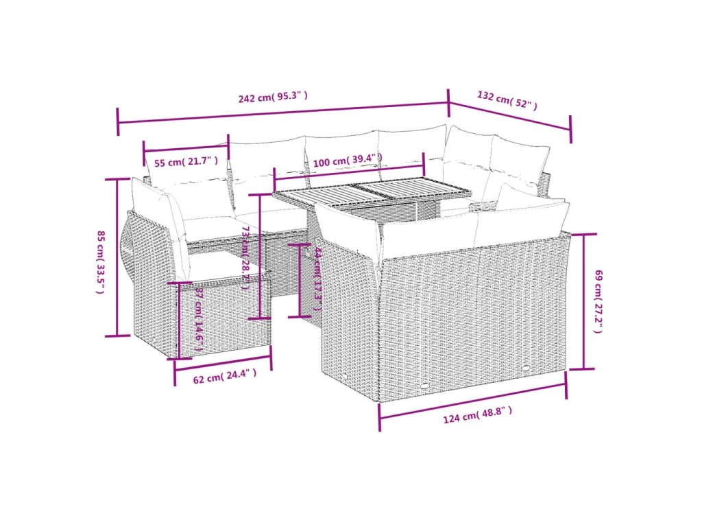 Tato zahradní sedací souprava je dokonalým doplňkem vaší zahrady, terasy nebo dvorku a poskytne vám pohodlné a příjemné místo, kde si můžete povídat s rodinou a přáteli nebo jen tak odpočívat a užívat si pobyt venku.