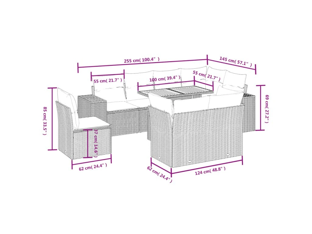 Tato zahradní sedací souprava je dokonalým doplňkem vaší zahrady, terasy nebo dvorku a poskytne vám pohodlné a příjemné místo, kde si můžete povídat s rodinou a přáteli nebo jen tak odpočívat a užívat si pobyt venku.