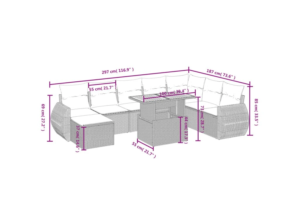 - Modulární design: Tato sada venkovního nábytku se vyznačuje modulární konstrukcí, je tedy zcela flexibilní a lze ji snadno přemisťovat, takže si můžete uspořádat venkovní nábytek dle vašich potřeb.