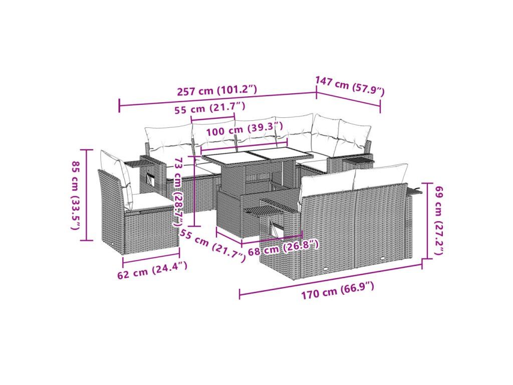 Tato zahradní sedací souprava je dokonalým doplňkem vaší zahrady, terasy nebo dvorku a poskytne vám pohodlné a příjemné místo, kde si můžete povídat s rodinou a přáteli nebo jen tak odpočívat a užívat si pobyt venku.
