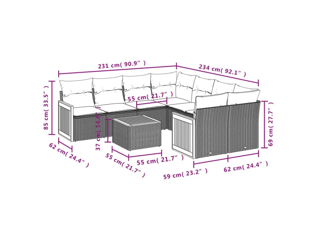 Tato zahradní sedací souprava je dokonalým doplňkem vaší zahrady, terasy nebo dvorku a poskytne vám pohodlné a příjemné místo, kde si můžete povídat s rodinou a přáteli nebo jen tak odpočívat a užívat si pobyt venku.