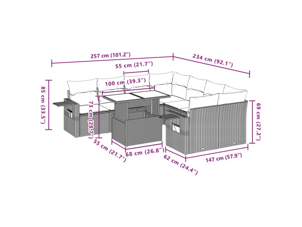 Tato zahradní sedací souprava je dokonalým doplňkem vaší zahrady, terasy nebo dvorku a poskytne vám pohodlné a příjemné místo, kde si můžete povídat s rodinou a přáteli nebo jen tak odpočívat a užívat si pobyt venku.