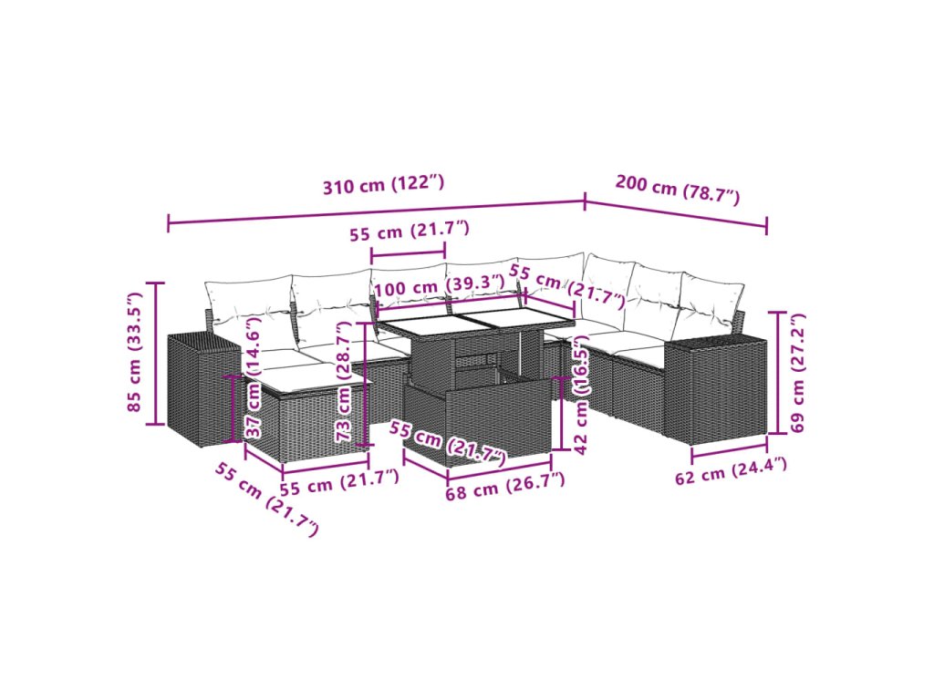 Tato zahradní sedací souprava je dokonalým doplňkem vaší zahrady, terasy nebo dvorku a poskytne vám pohodlné a příjemné místo, kde si můžete povídat s rodinou a přáteli nebo jen tak odpočívat a užívat si pobyt venku.