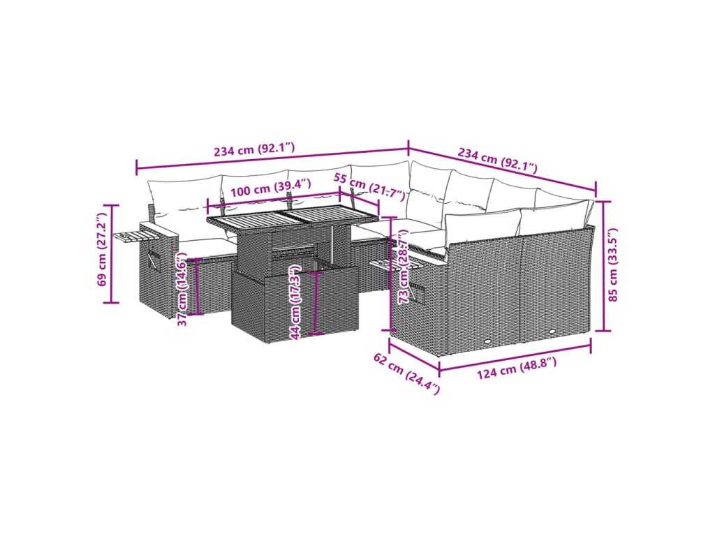 Tato zahradní sedací souprava je dokonalým doplňkem vaší zahrady, terasy nebo dvorku a poskytne vám pohodlné a příjemné místo, kde si můžete povídat s rodinou a přáteli nebo jen tak odpočívat a užívat si pobyt venku.