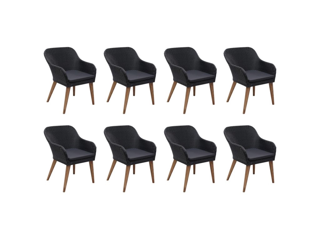 Jídelní stůl je zhotovený z masivního akáciového dřeva s olejovaným povrchem, takže je stabilní, odolný a nenáročný na údržbu. Jídelní židle mají rám z práškově lakované oceli, opletený PE ratanem, který výborně vzdoruje klimatickým vlivům. Dlouho vám proto vydrží a snadno je očistíte. Ergonomický tvar spolu s hustě polstrovanými poduškami vám při sezení zaručí maximální pohodlí. Polyesterové potahy podušek nevyžadují téměř žádnou údržbu a dají se jednoduše stáhnout a oprat.