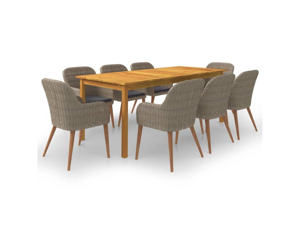 Jídelní stůl je zhotovený z masivního akáciového dřeva s olejovaným povrchem, takže je stabilní, odolný a nenáročný na údržbu. Jídelní židle mají rám z práškově lakované oceli, opletený PE ratanem, který výborně vzdoruje klimatickým vlivům. Dlouho vám proto vydrží a snadno je očistíte. Ergonomický tvar spolu s hustě polstrovanými poduškami vám při sezení zaručí maximální pohodlí. Polyesterové potahy podušek nevyžadují téměř žádnou údržbu a dají se jednoduše stáhnout a oprat.