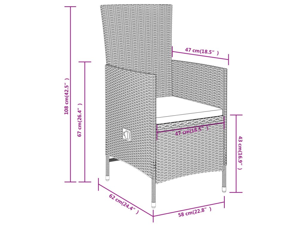 Stůl i židle mají rámy z práškově lakované oceli, jsou tedy robustní, stabilní a vhodné pro každodenní venkovní použití. Židle jsou vyrobené z voděodolného PE ratanu, takže se snadno čistí a hodně toho vydrží. Opěradlo si můžete nastavit stisknutím tlačítka na boku. Nábytek má lehkou konstrukci, lze ho tudíž bez námahy přesouvat. Husté polstrované podušky na sedák vám navíc zajistí mimořádné pohodlí. Jejich polyesterové potahy jsou nenáročné na údržbu a dají se stáhnout a vyprat. Hladká skleněná stolní deska, kterou jednoduše očistíte vlhkým hadříkem, je ideální k podávání jídla a pití nebo k vystavení různých dekorativních předmětů.