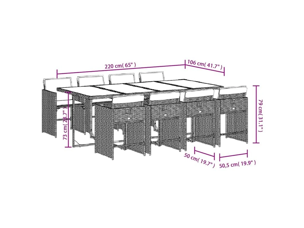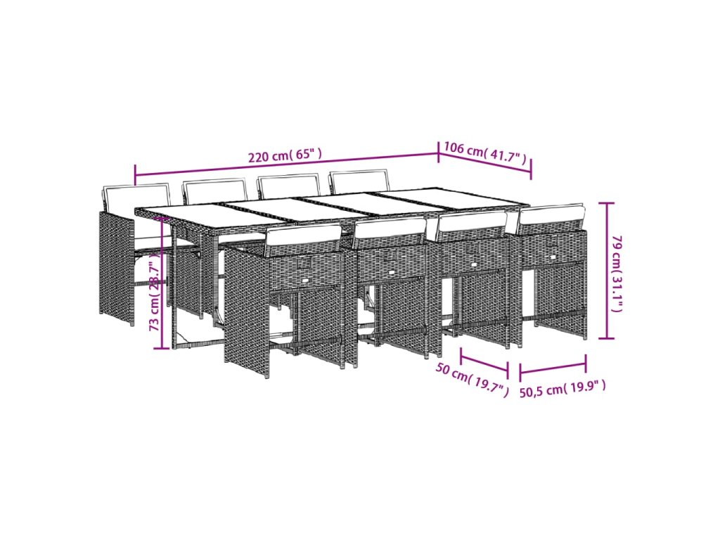 - Rozměry: 220 x 106 x 73 cm (D x Š x V)