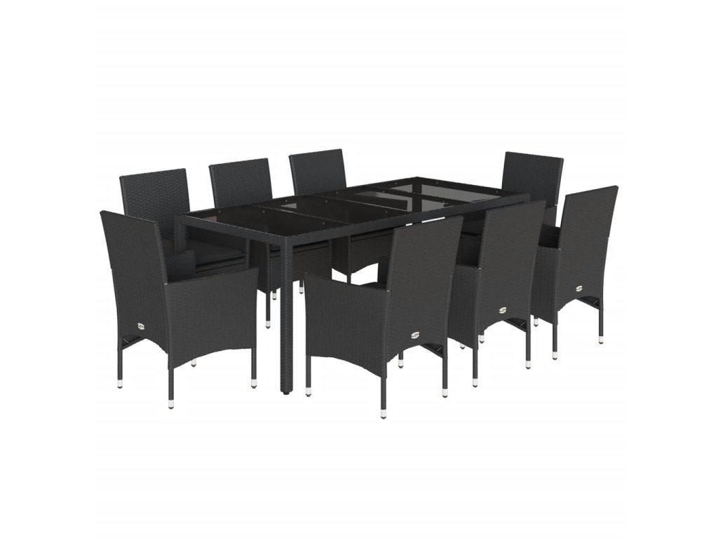 9dílný zahradní jídelní set s poduškami černý polyratan a sklo 3278548