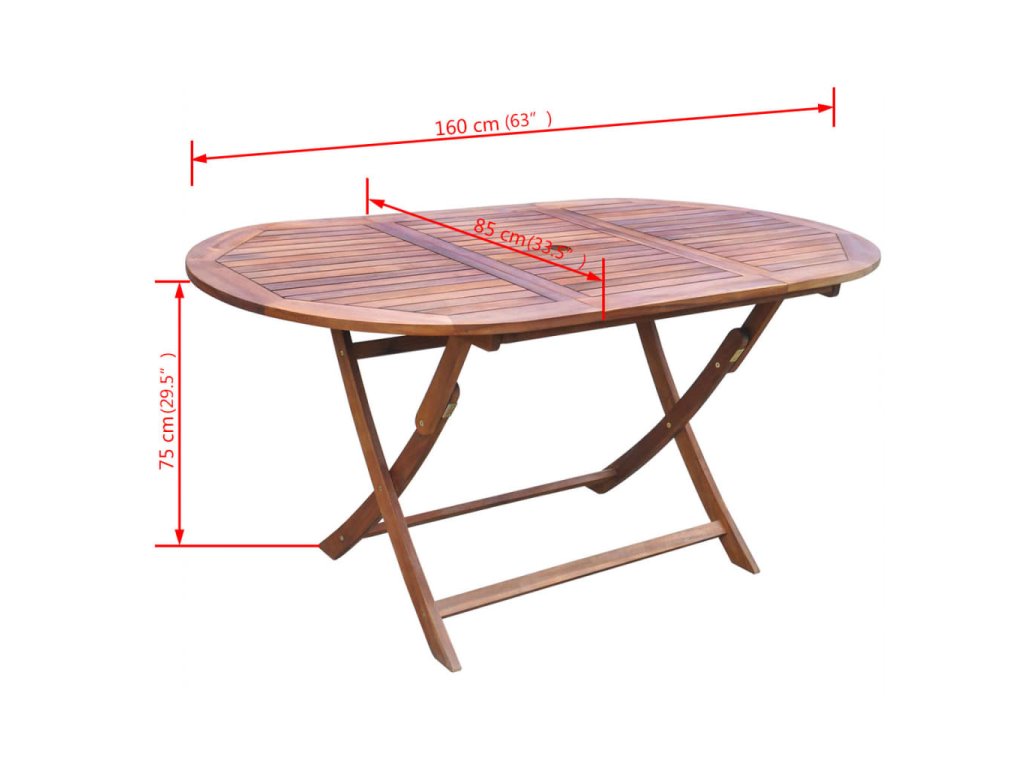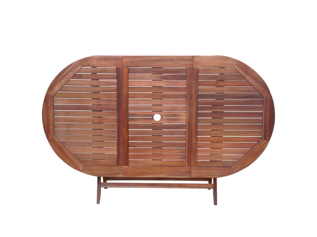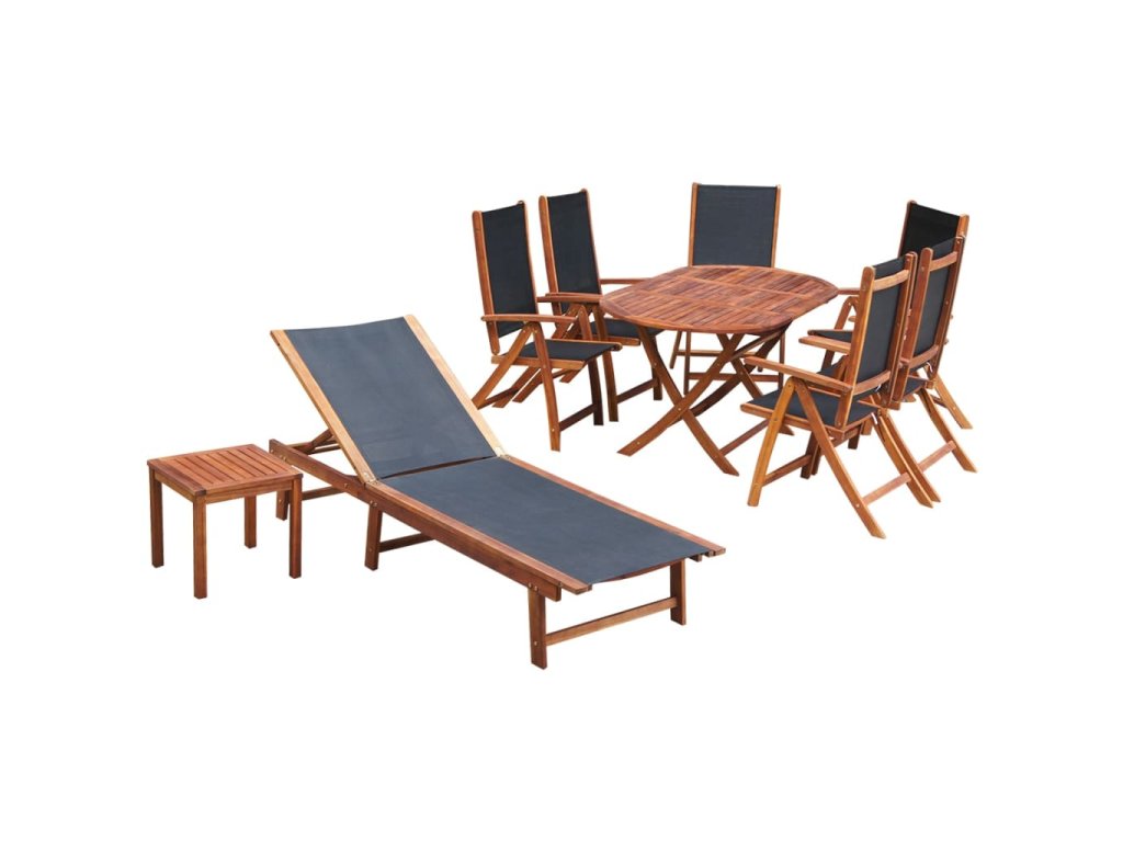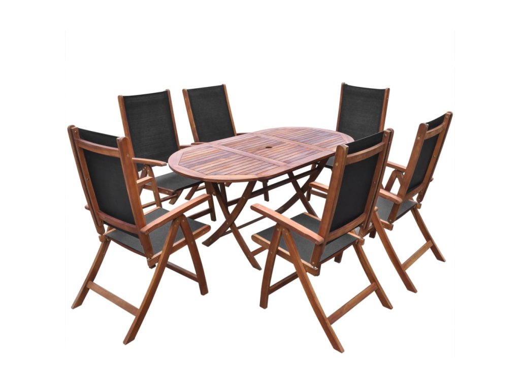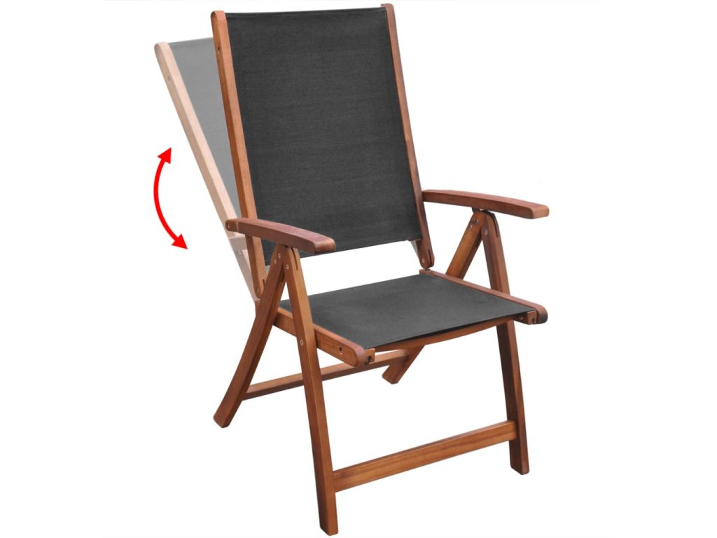 Jídelní stůl je vyrobený z vysoce kvalitní masivní akácie. Jedná se o tvrdé tropické dřevo, které je odolné vůči povětrnostním vlivům a trvanlivé. Povrch ošetřený tmavým olejovým nátěrem snadno očistíte vlhkým hadříkem. Židle lze nastavit do 5 poloh a mají hladké textilenové čalounění, jsou měkké na dotek a odolné vůči povětrnostním vlivům. Pokud je zrovna nepoužíváte, můžete stůl i židle složit, abyste ušetřili místo.
