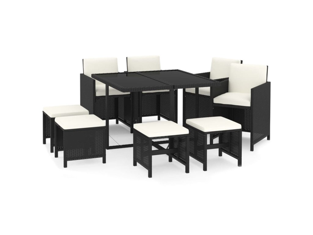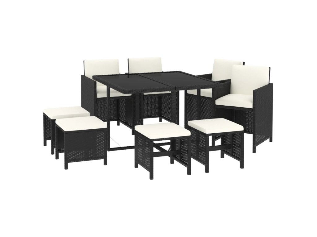 Tento venkovní jídelní set, vyrobený z PE ratanu odolného vůči vodě a povětrnostním vlivům se snadno čistí, je odolný a vhodný pro každodenní použití. Ocelový rám s práškovým nástřikem zajišťuje odolnost stolu, židlí a stoliček. Skleněná stolní deska je ideální pro podávání nápojů a jídla nebo vystavení různých dekorativních předmětů. Silné, měkké, pěnou polstrované podušky na sedák a opěradlo zvyšují komfort při sezení. A co víc, opěradlo se dá sklopit a uložit židle pod stůl, čímž ušetříte místo, když se nábytek nepoužívá. Vzhledem k lehké konstrukci se všechny části setu snadno přemisťují.