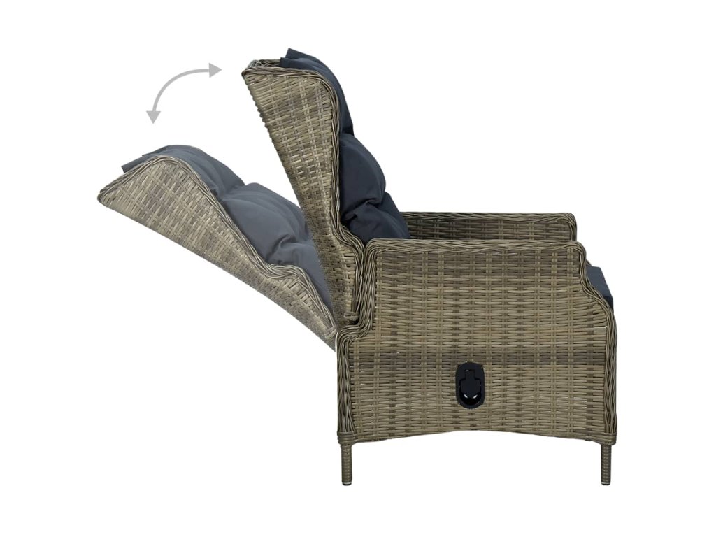 Zahradní nábytek je vyrobený z lehkého kulatého PE ratanu, který nevyžaduje téměř žádnou údržbu a snadno se čistí vlhkým hadříkem. Skvěle se proto hodí pro venkovní použití. Křesla i stůl mají rám z práškově lakované oceli, což jim zajišťuje výtečnou stabilitu a odolnost. Skleněná stolní deska dodá vašemu venkovnímu bydlení nádech luxusu a výborně vám poslouží k podávání večeře nebo k vystavení dekorativních předmětů. Hustě polstrované podušky vám při odpočinku poskytnou maximální pohodlí. Jejich potahy jsou opatřené zipem, aby se vám lépe stahovaly a praly. Mechanismus s plynovým pístem umožňuje nastavit opěradlo do různých pozic. Stisknutím bočního tlačítka můžete opěradlo sklopit a příjemně se natáhnout.