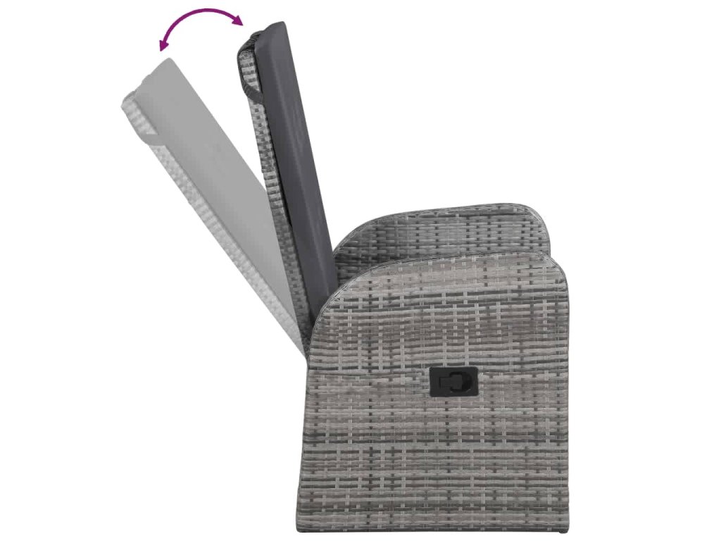 Stůl i židle mají rámy z práškově lakované oceli, jsou tedy robustní, stabilní a vhodné pro každodenní venkovní použití. Židle jsou vyrobené z voděodolného PE ratanu, takže se snadno čistí a hodně toho vydrží. Opěradlo i opěrku nohou si můžete nastavit zatažením za tlačítko na boku. Nábytek má lehkou konstrukci, lze ho tudíž bez námahy přesouvat. Husté polstrované podušky na sedák vám navíc zajistí mimořádné pohodlí. Jejich polyesterové potahy jsou nenáročné na údržbu a dají se stáhnout a vyprat. Hladká skleněná stolní deska, kterou jednoduše očistíte vlhkým hadříkem, je ideální k podávání jídla a pití nebo k vystavení různých dekorativních předmětů.