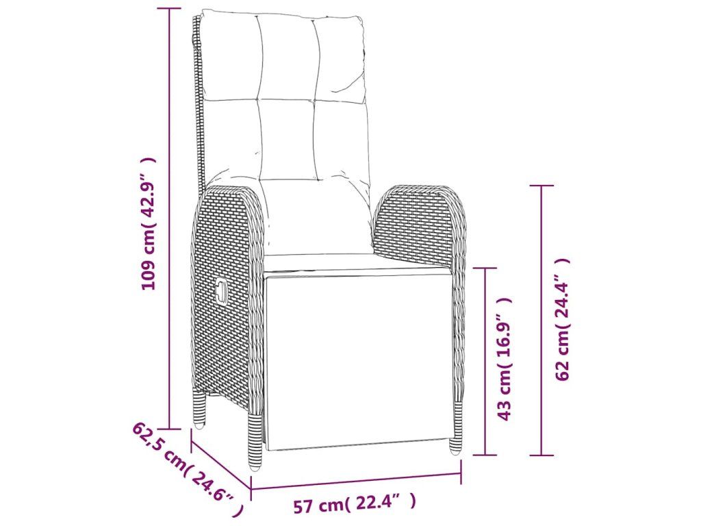 - Rozměry ve sklopené poloze (bez opěrky nohou): 57 x 99 x 95 cm (Š x H x V)