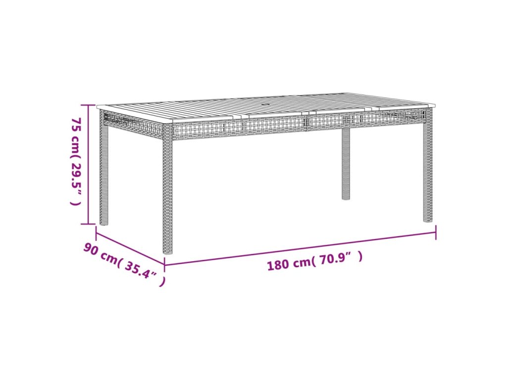 - Materiál: PE ratan, práškově lakovaná ocel, masivní akáciové dřevo s olejovou povrchovou úpravou