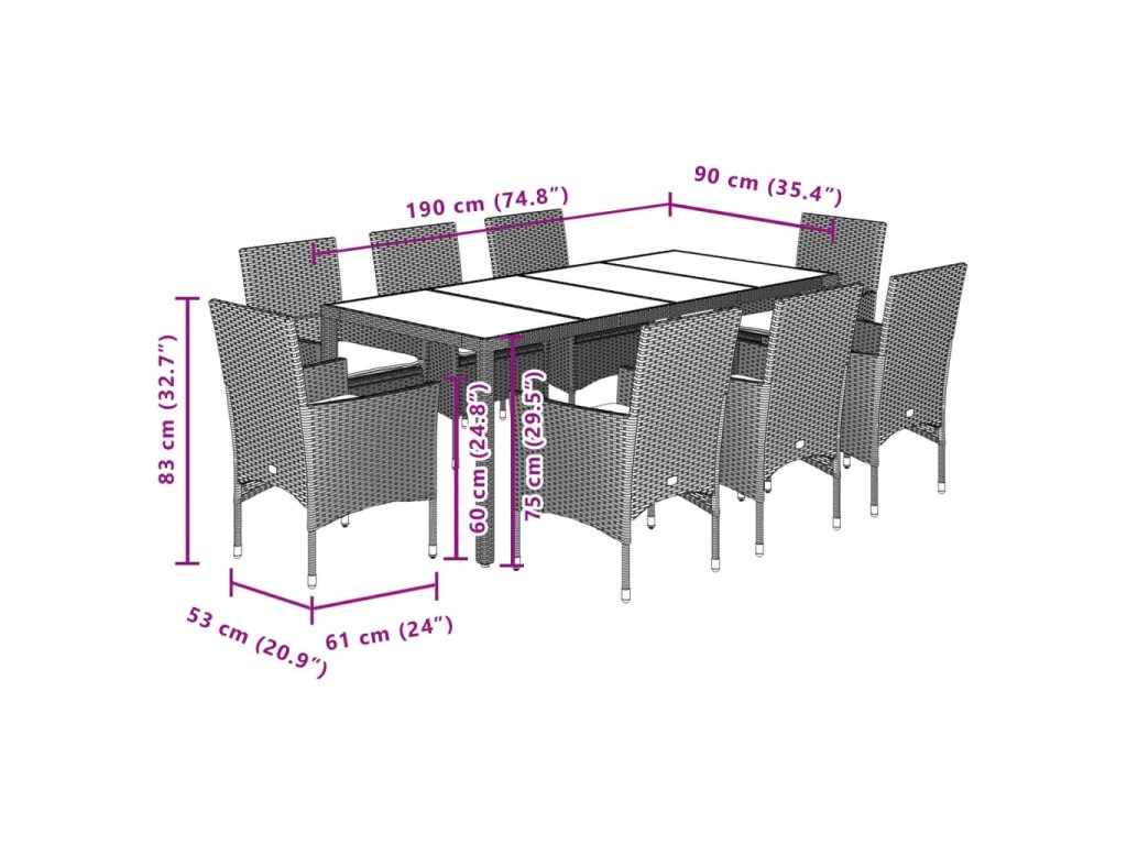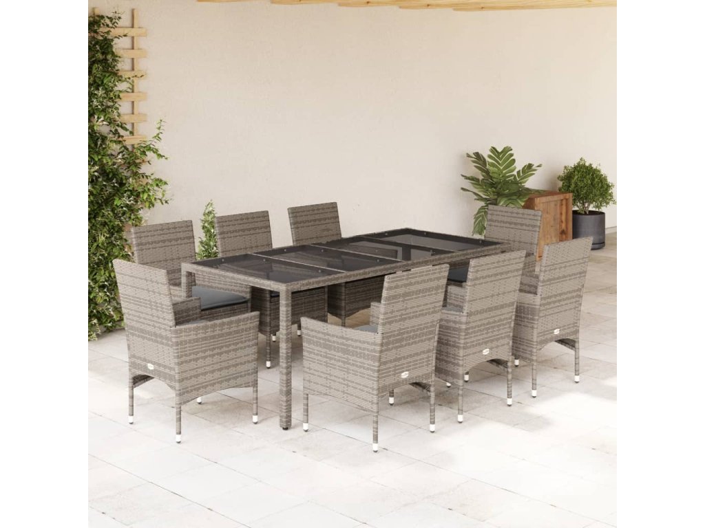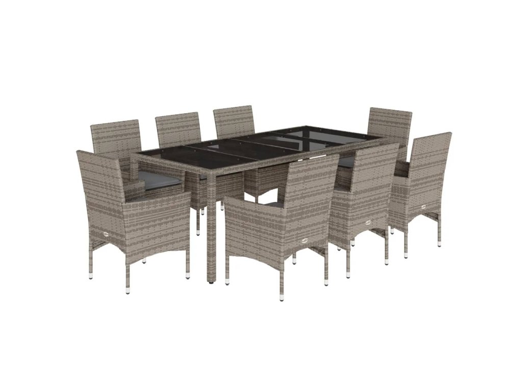 9dílný zahradní jídelní set s poduškami šedý polyratan a sklo 3278560