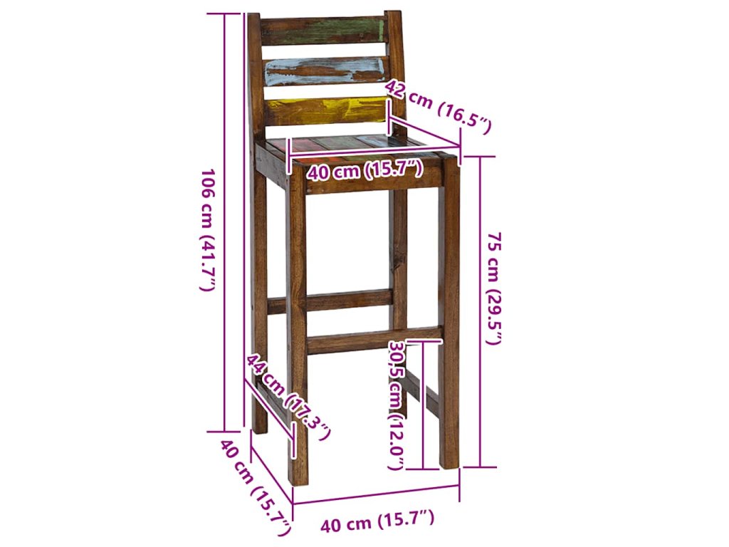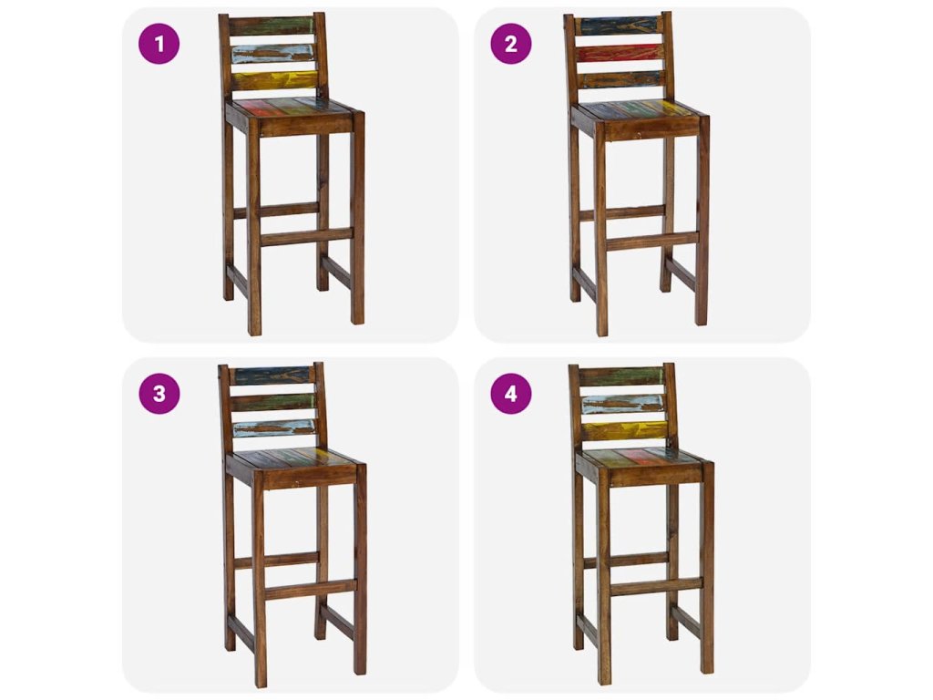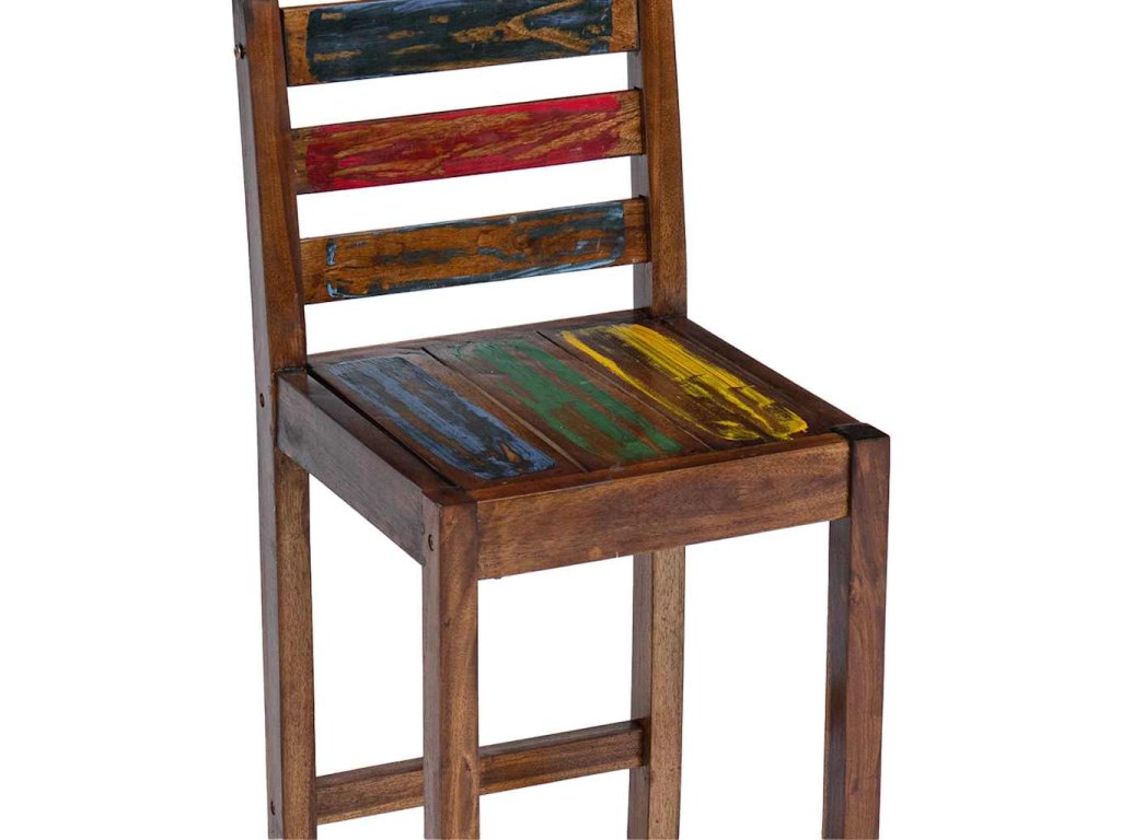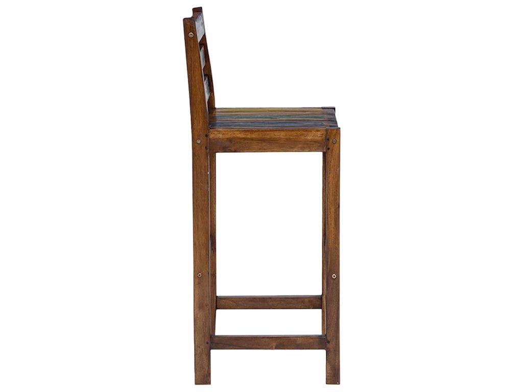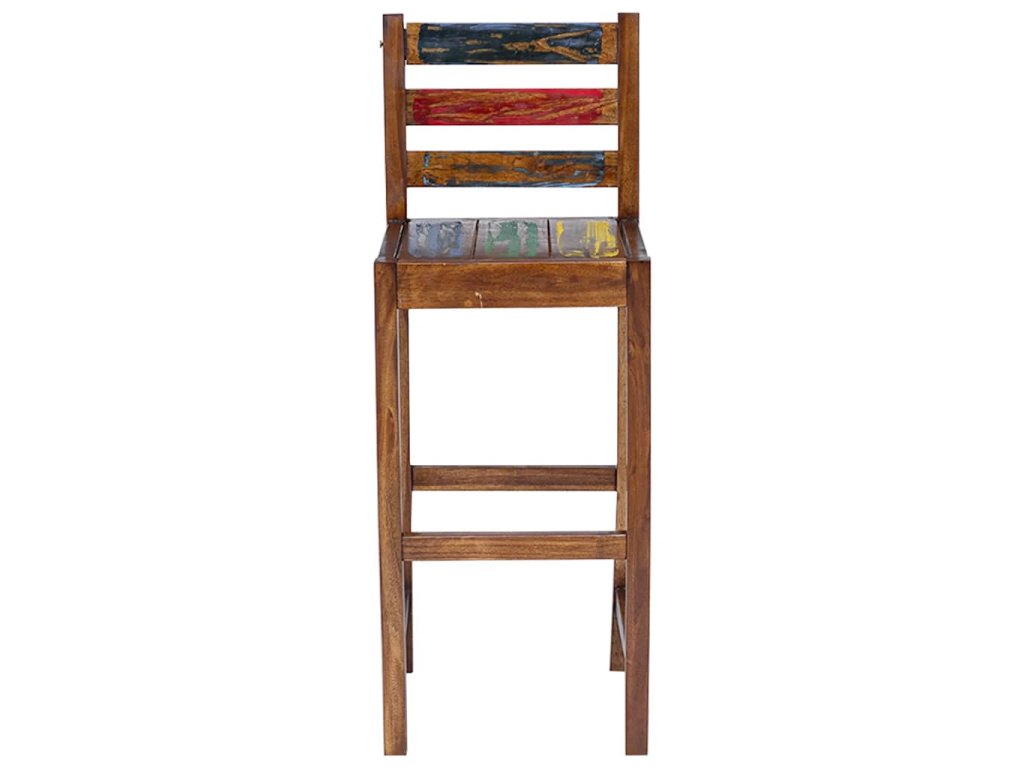 Barové židle jsou vyrobeny z masivního recyklovaného dřeva, které pochází ze starých rybářských lodí a obsahuje různé typy dřeva, jako je dřevo mindi (bílý cedr), akácie, pobřežní ibišek apod. To znamená, že recyklované dřevo má charakteristiky všech těchto různých druhů dřevin. Navíc je již zestárlé, zvětralé a vyschlé, takže se nesmršťuje ani neohýbá. Známky opotřebení a zřetelná kresba dřeva dávají setu jeho vlastní příběh a unikátní vzhled. Každá fáze výrobního procesu byla provedena s největší pečlivostí, ať už se jedná o leštění, natírání nebo lakování. Montáž barových stoliček je snadná. Balení obsahuje 2 barové stoličky.