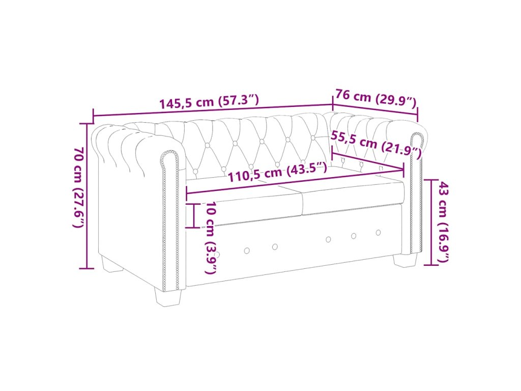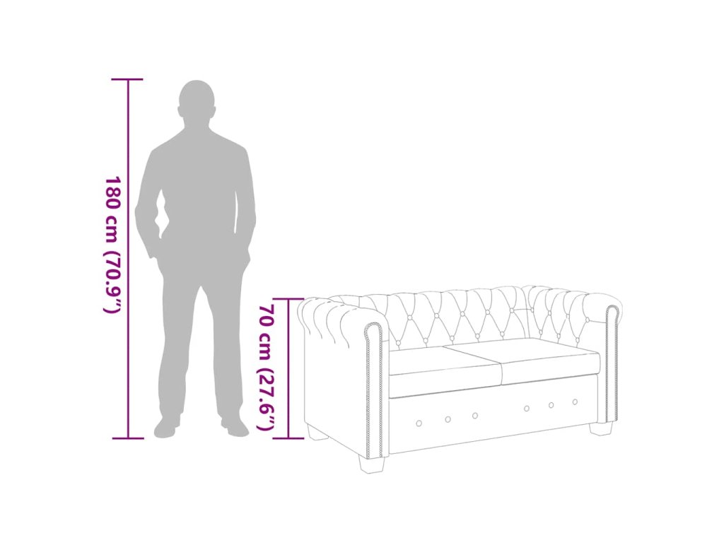 Tato sedačka Chesterfield je perfektní kombinací pohodlí a sofistikovanosti a bude skvělým doplňkem do každého domova či kanceláře. Tato 2místná pohovka s ozdobným prošíváním a cvočky a půvabně zakřivenými područkami dodá každému interiéru nádech luxusu a stylu.