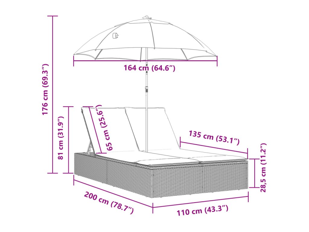 - Rozměry bez slunečníku: 200 x 110 x 37/54/68,5/81 cm (Š x H x V)
