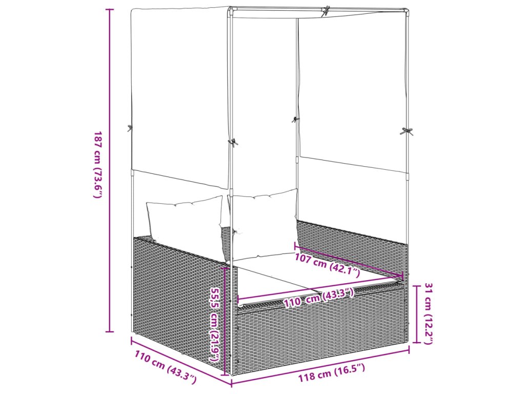 - Rozměry bez střechy a závěsů: 115 x 110 x 55,5 cm (D x Š x V)