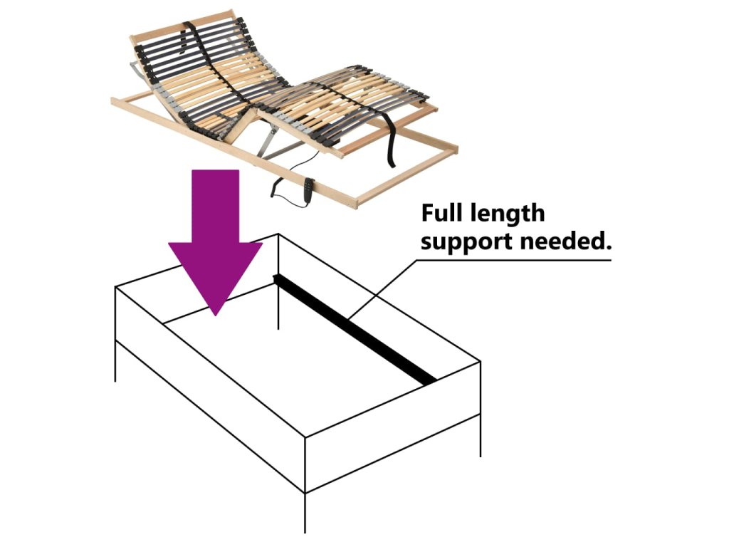 Rošt postele s rámem z masivního bukového dřeva a břízovými lamelami je robustní a odolný. Sedm komfortních zón poskytuje tělu optimální podporu. Oba konce lamel jsou na místě upevněné gumovými uzávěry SBS pro lepší stabilitu celé konstrukce. S pomocí 6 nastavitelných dvojitých lamel ve středové zóně můžete uzpůsobit pevnost roštu svým potřebám. Oblasti pod hlavou a pod nohami jsou nastavitelné příručním ovladačem pro vaše pohodlí.