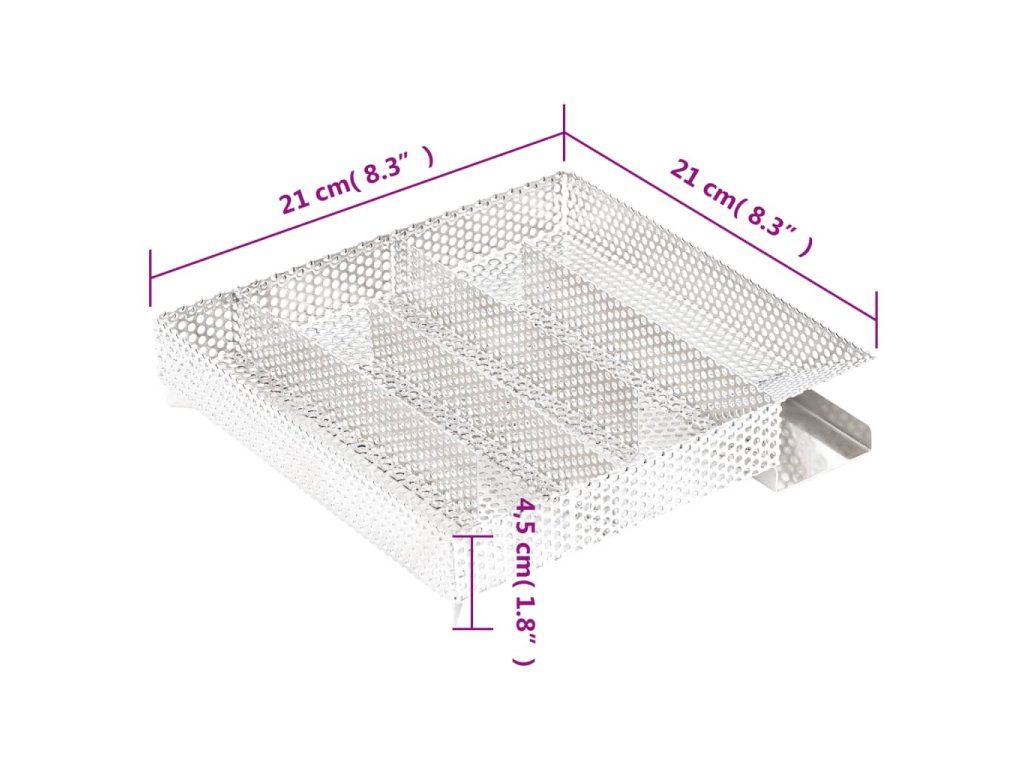 • Pevná mřížková konstrukce: Kompaktní mřížka čtvercového tvaru umožňuje rovnoměrné a pomalé hoření třísek až po dobu 12 hodin. Délka trvání závisí především na druhu dřeva určeného k uzení. Pro dosažení nejlepších výsledků se doporučuje používat štěpky o velikosti zrn 0,5–2,0 mm.