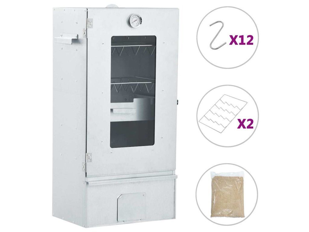 Udírna je vybavená teploměrem, abyste měli neustále přehled o teplotě uvnitř komory. Okénkem můžete rovněž kontrolovat připravované jídlo. Udící trouba měří na výšku 83 cm, takže máte spoustu místa na uzení masa.