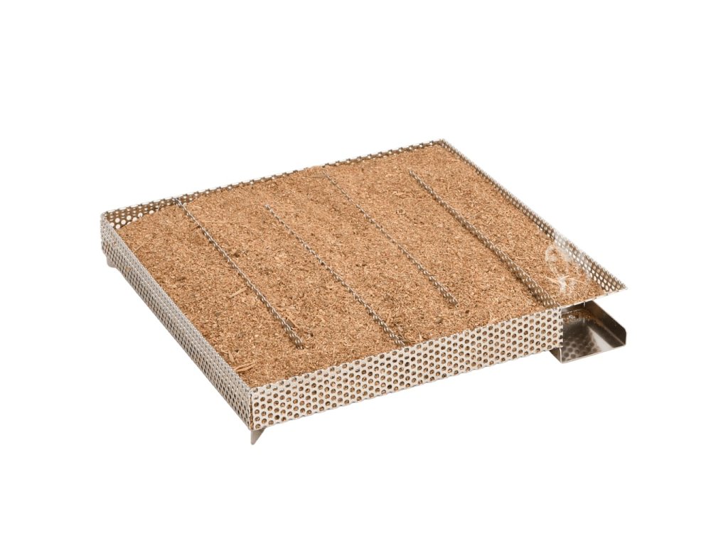 - Snadné použití: Stačí naplnit pilinami a zapálit čajovou svíčkou, dokud piliny nezačnou měnit barvu. Vyjměte čajovou svíčku a vložte generátor do udírny. Kompaktní čtvercová mřížka umožňuje rovnoměrné a pomalé hoření štěpků po dobu až 16 hodin.