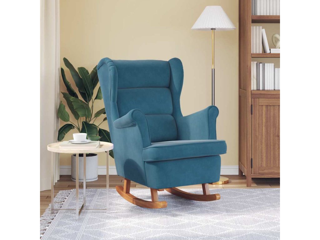 Houpací křeslo s opěradlem, modrý samet a masivní dřevo 329362