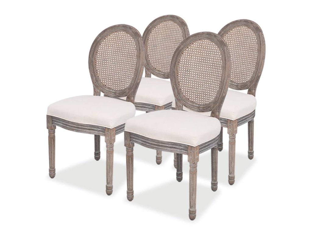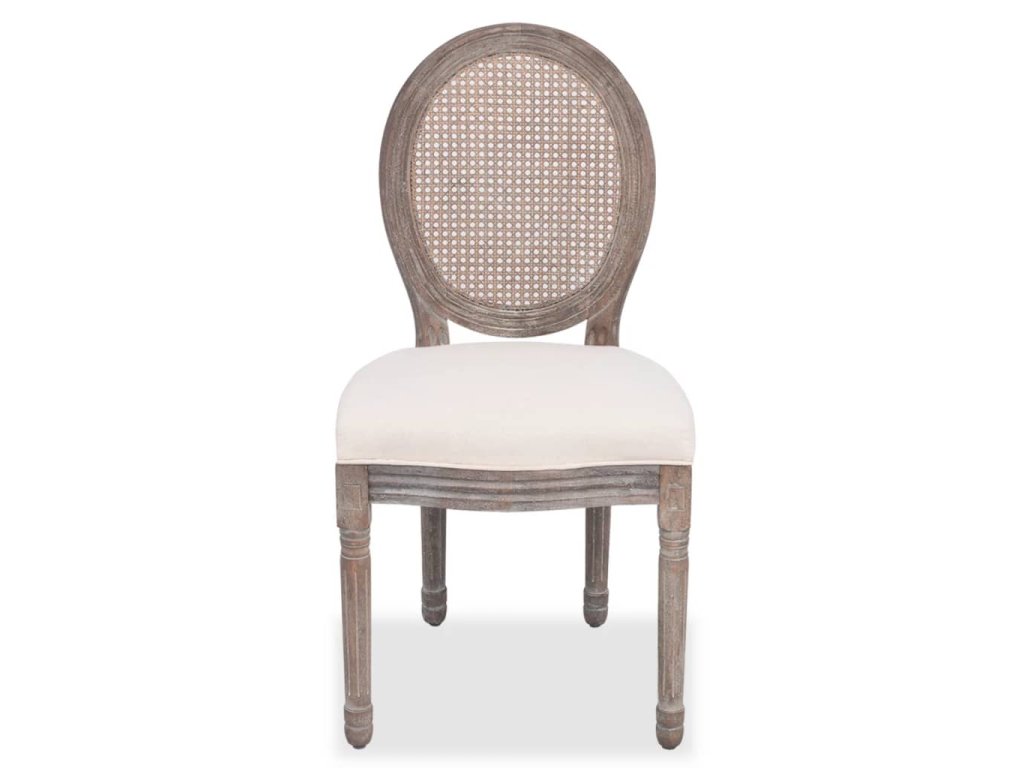 Silnou vrstvou pěny polstrované sedačky jsou čalouněné v lněné látce. Tyto plátěné jídelní židle mají ratanové opěradlo, které jim dodává rustikální šarm. Dřevěné rámy a nohy dělají židle velmi stabilními a odolnými.
