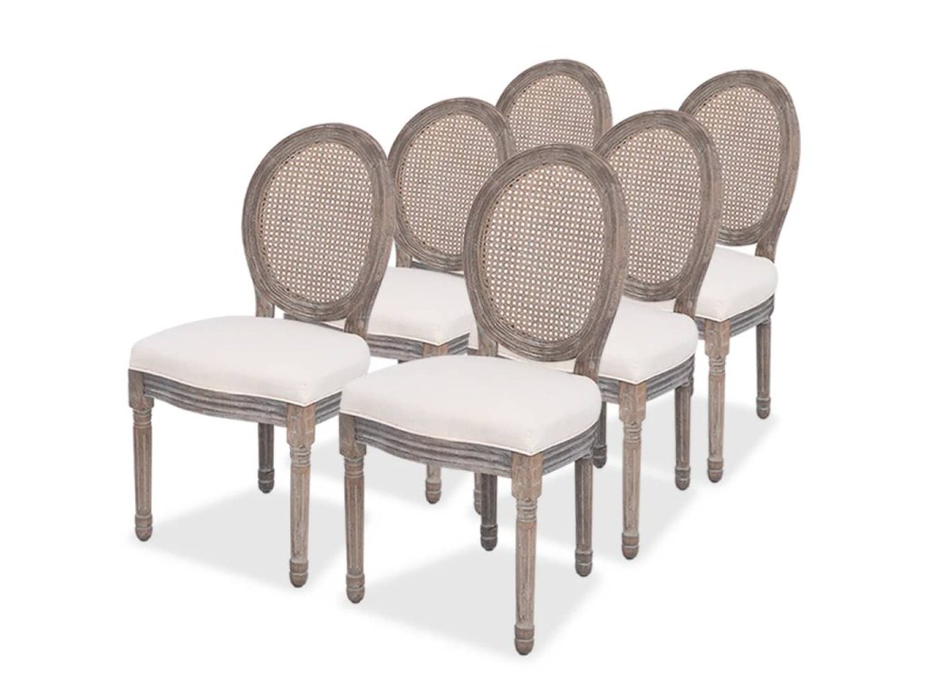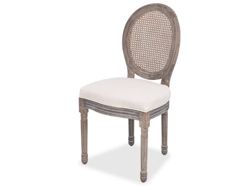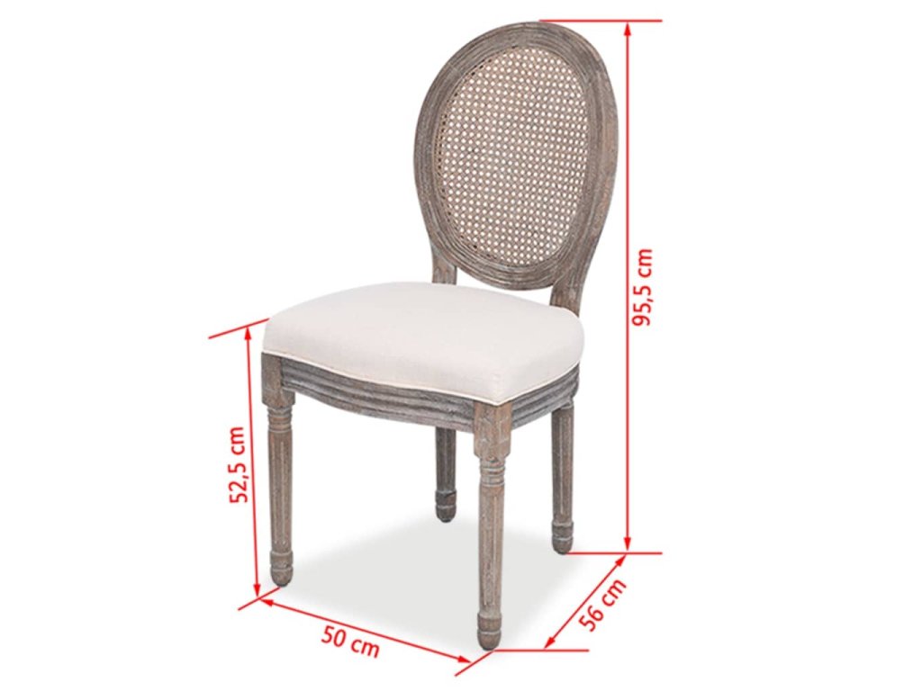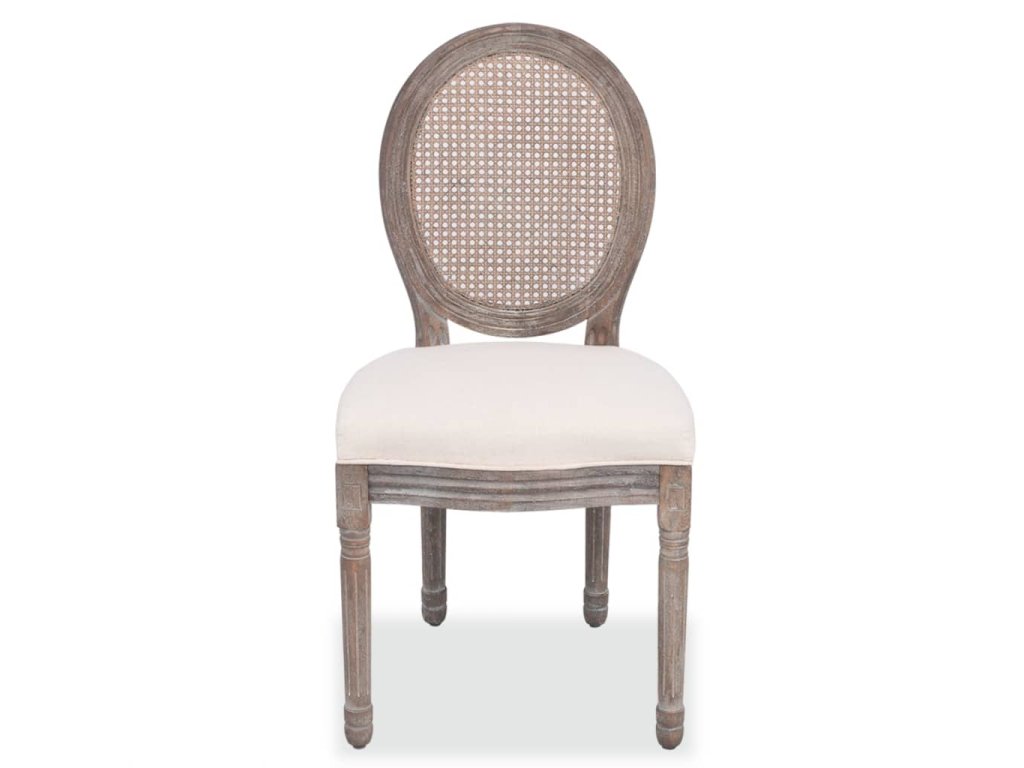 Silnou vrstvou pěny polstrované sedačky jsou čalouněné v lněné látce. Tyto plátěné jídelní židle mají ratanové opěradlo, které jim dodává rustikální šarm. Dřevěné rámy a nohy dělají židle velmi stabilními a odolnými.