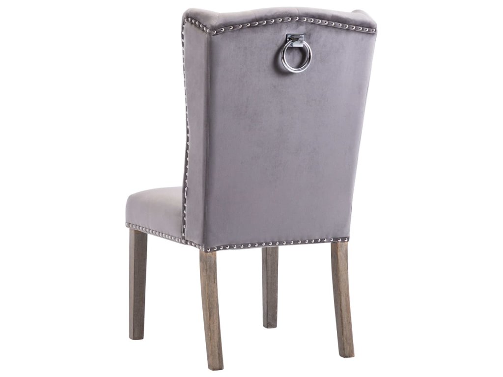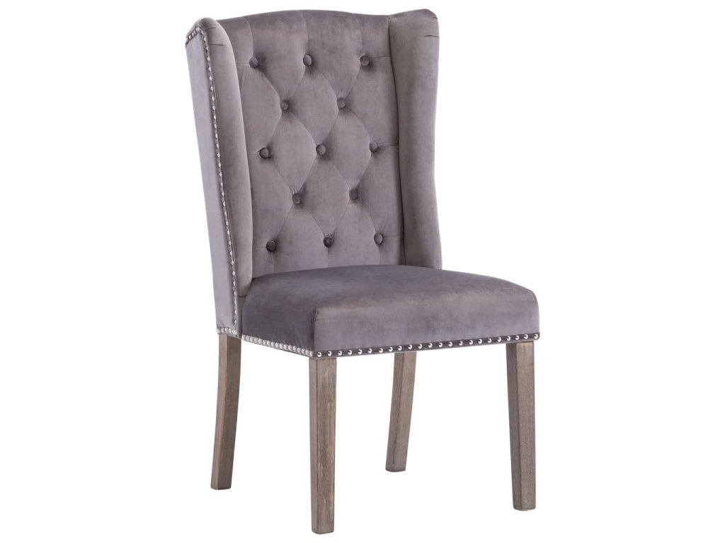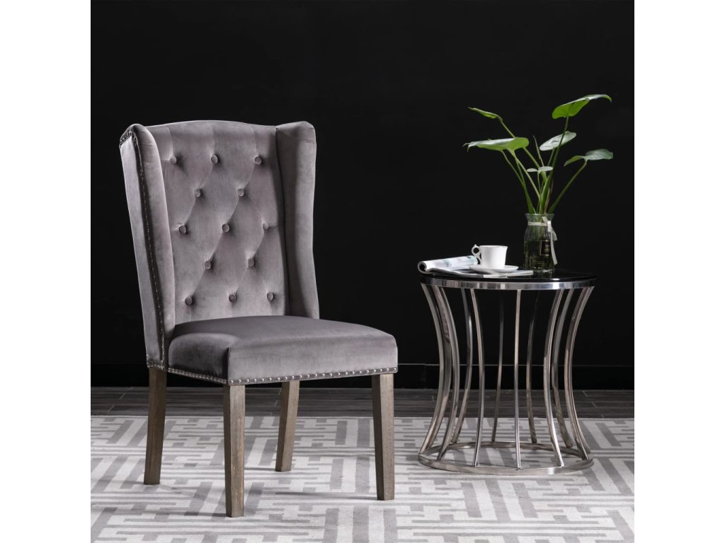 Tato jídelní židle je čalouněná na dotek měkkou sametovou látkou a poskytne vám pohodlné místo pro stolování, čtení nebo relaxaci. Dekorativní knoflík na opěradle a kovové nýty podél okrajů zvyšují klasickou krásu židle. Jídelní židle má masivní kaučukovníkové nohy, je tedy stabilní a robustní.