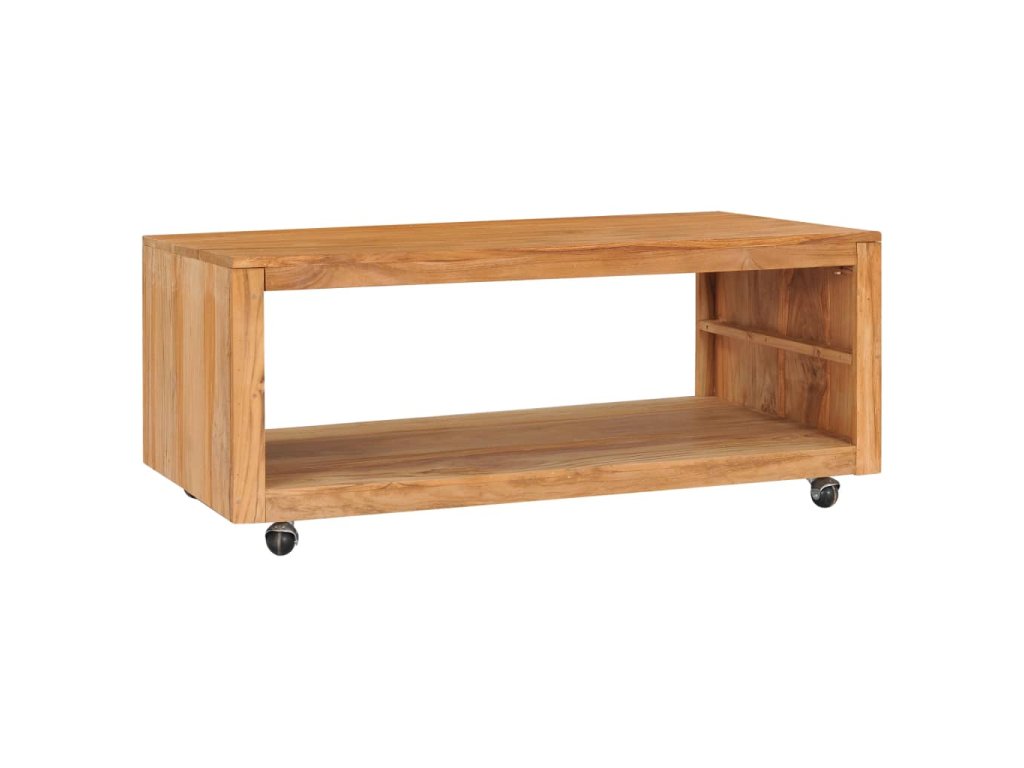 Tento dřevěný stolek je zhotovený z masivního teakového dřeva, má tedy pevnou a odolnou konstrukci. Přírodní olejování zajišťuje hladký povrch, což vám usnadní čištění a pravidelnou péči. Ve spodní části stolku najdete polici, kde si můžete ukládat nejrůznější věci. Pohyblivá kolečka vám pomohou nábytek přesunout a umístit tam, kam právě potřebujete.