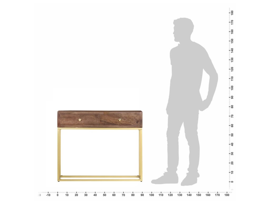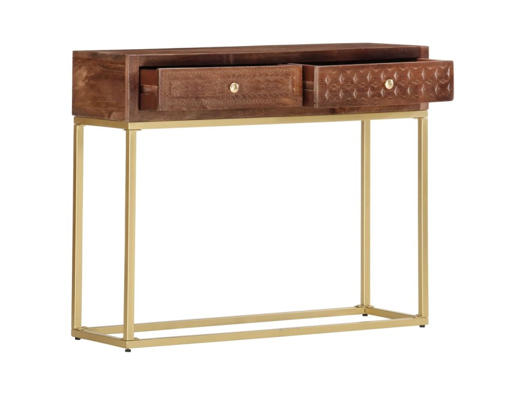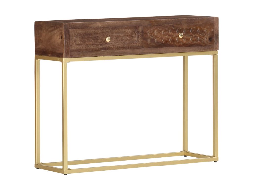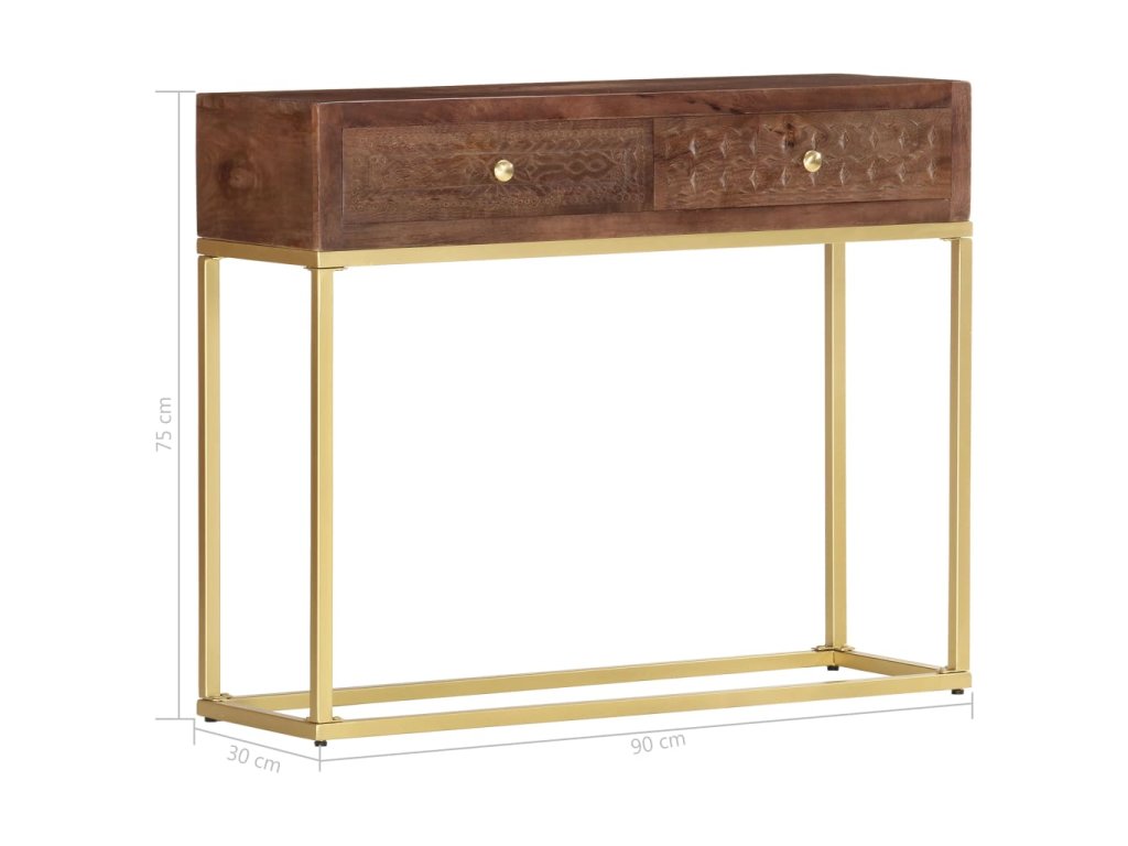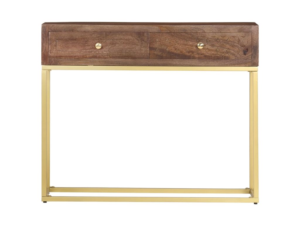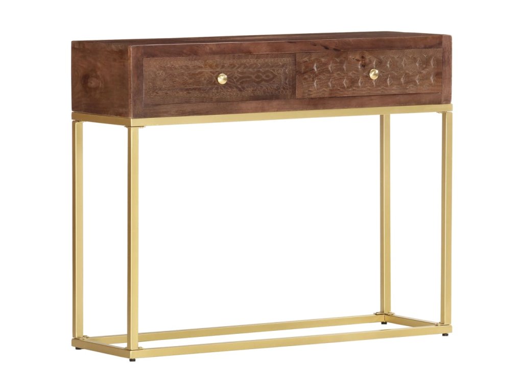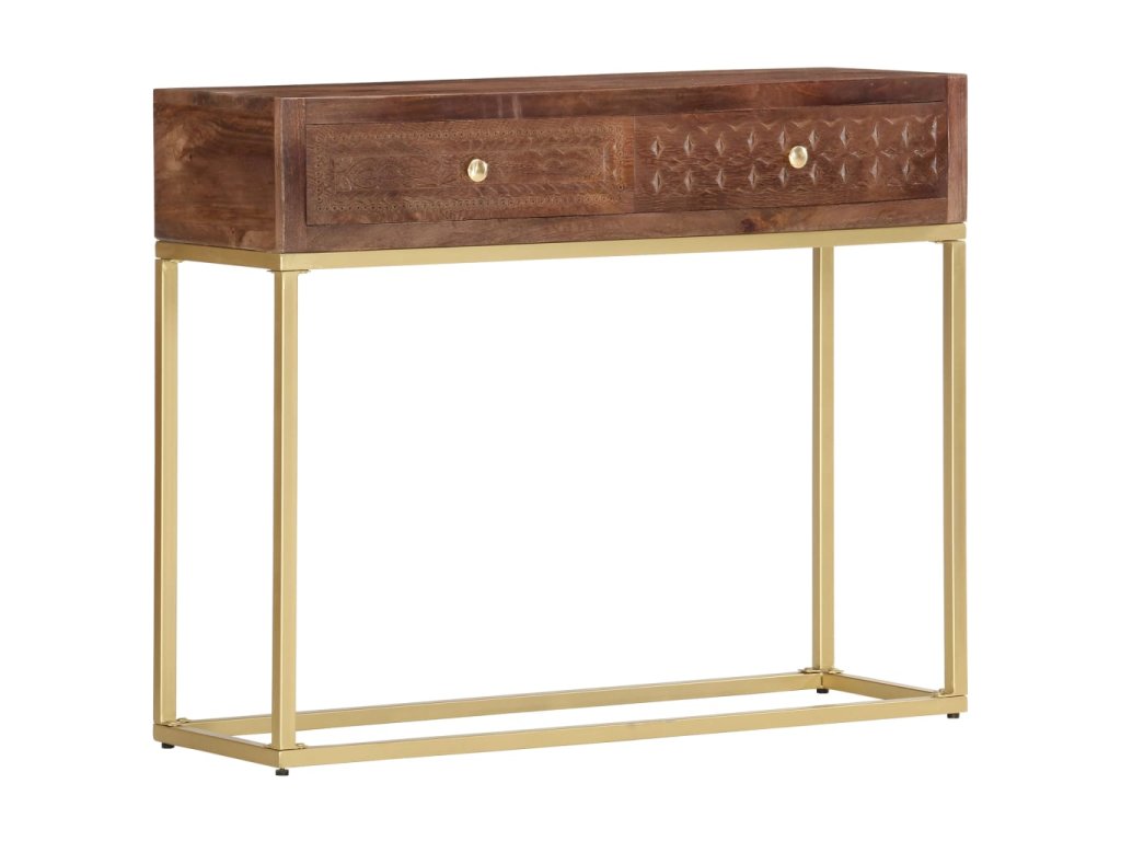 Konzolový stolek s ručně vyřezávaným čelem je zhotoven z masivního mangovníku, což je husté a robustní tvrdé dřevo, jehož povrch se vyznačuje hnědými či zlatými pruhy a konturami. Každá fáze výrobního procesu je prováděná s mimořádnou péčí, ať už se jedná o leštění nebo lakování. Řemeslné zpracování pak podtrhuje působivé retro vzezření nábytku. Krásná kresba dřeva je neopakovatelná a dává každému kusu nábytku unikátní charakter, kterým se lehce liší od všech ostatních. Práškově lakovaný ocelový rám přispívá k industriálnímu stylu nízkého stolku. Uvnitř najdete 2 zásuvky, které vám poskytnou spoustu prostoru k přehlednému ukládání všech možných maličkostí tak, abyste je měli vždy na dosah. Sestavení produktu je jednoduché.