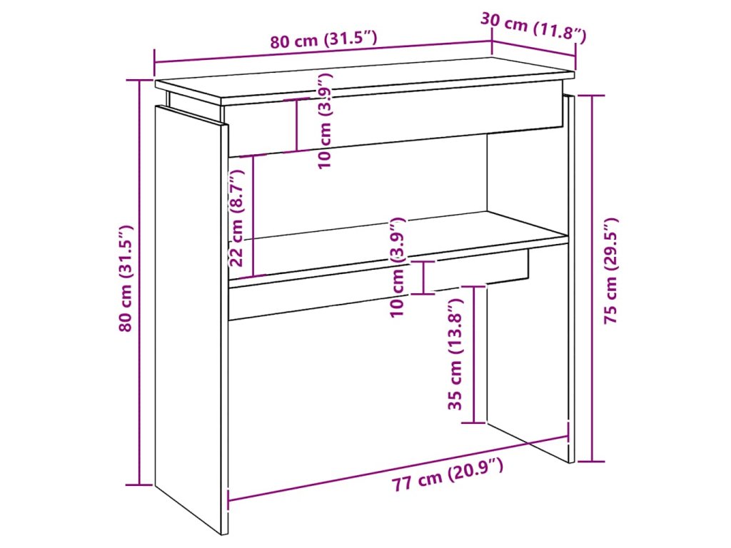 Stolek do předsíně je vyrobený z kvalitního kompozitního dřeva, takže je odolný a snadno se čistí. Je ideálním místem pro odložení klíčů nebo pro vystavení pokojových rostlin, vonných svíček a jiných dekorativních předmětů. Umožní vám tak přehledně si uspořádat svůj prostor a udržet v něm pořádek. Tento stolek nezabere mnoho místa, a přitom zkrášlí váš vchod, předsíň, obývací pokoj nebo kancelář.